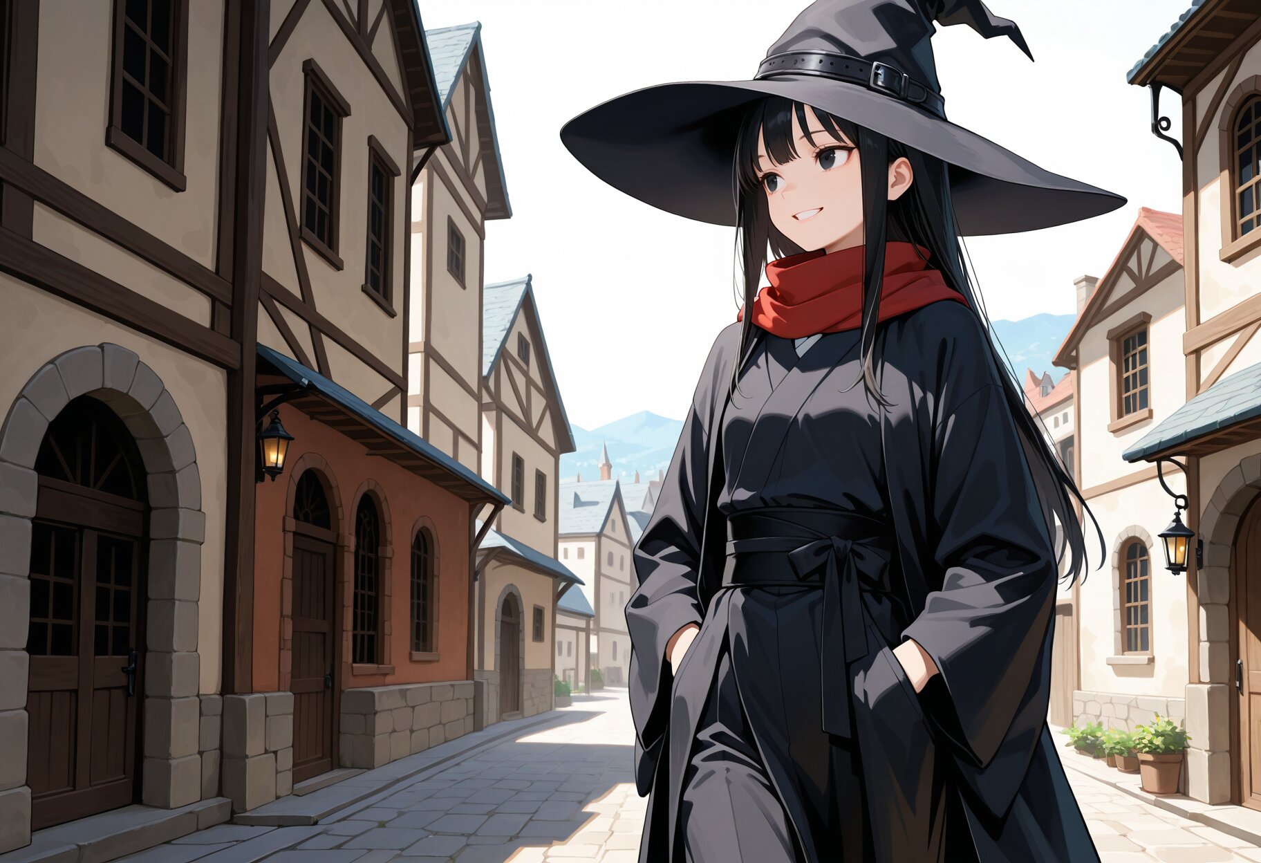 masterpiece,best quality,highres,ultra detailed,highly detailed,detailed eyes,perfect anatomy,general,1girl,solo,17yo,cute,(hands in pockets, black witch hat,long red scarf,grin),slender,small breasts,long sleeves,black hair,long hair,bangs,black eyes,light smile,Witch girl,(long black cloak,long black kimono,long black robe,black obi,long black cargo pants),boots,slender girl,BREAK looking away,cowboy shot,Walking, town of a medieval European fantasy world,fantasy,