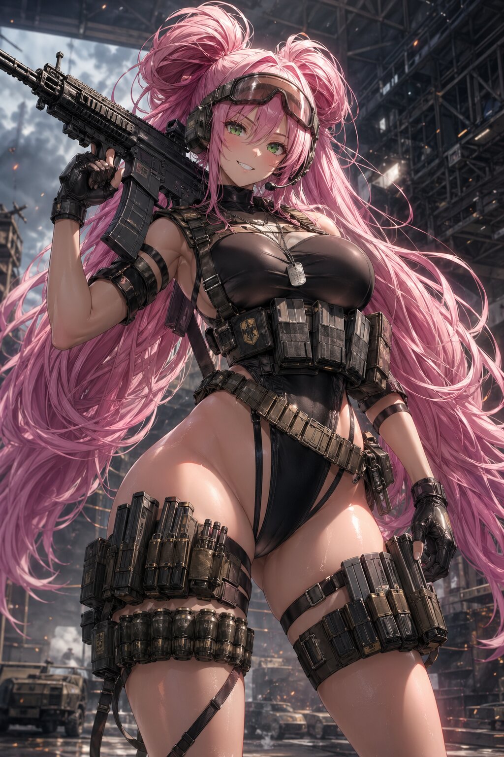 (absurdly long pink hair),(grenn eyes:1.5),(high bun twintail:1.6),(steam:2.5), (upper body:1.8), tactical military style, standing pose, confident expression, combat vest, military gloves, headset or tactical goggles, dog tags, ultra high-leg leotard, ammo belt, holding assault rifle, finger off trigger, weapon slung over shoulder, (heavy ammo pouches tightly strapped to upper thighs:1.5), (multiple rifle magazines attached directly to thighs:1.4), (grenade holders wrapped around each thigh just below high-leg line:1.4), (tactical straps pressing against skin:1.3), smile, 1girl, long hair, (large breasts and hips:1.3), masterpiece, best quality, ultra-detailed, 8k resolution, very aesthetic, amazing quality, background of military base, hangar, or battlefield ruins (dynamic pose:2.2),dynamic angle,masterpiece,best quality,very aesthetic,