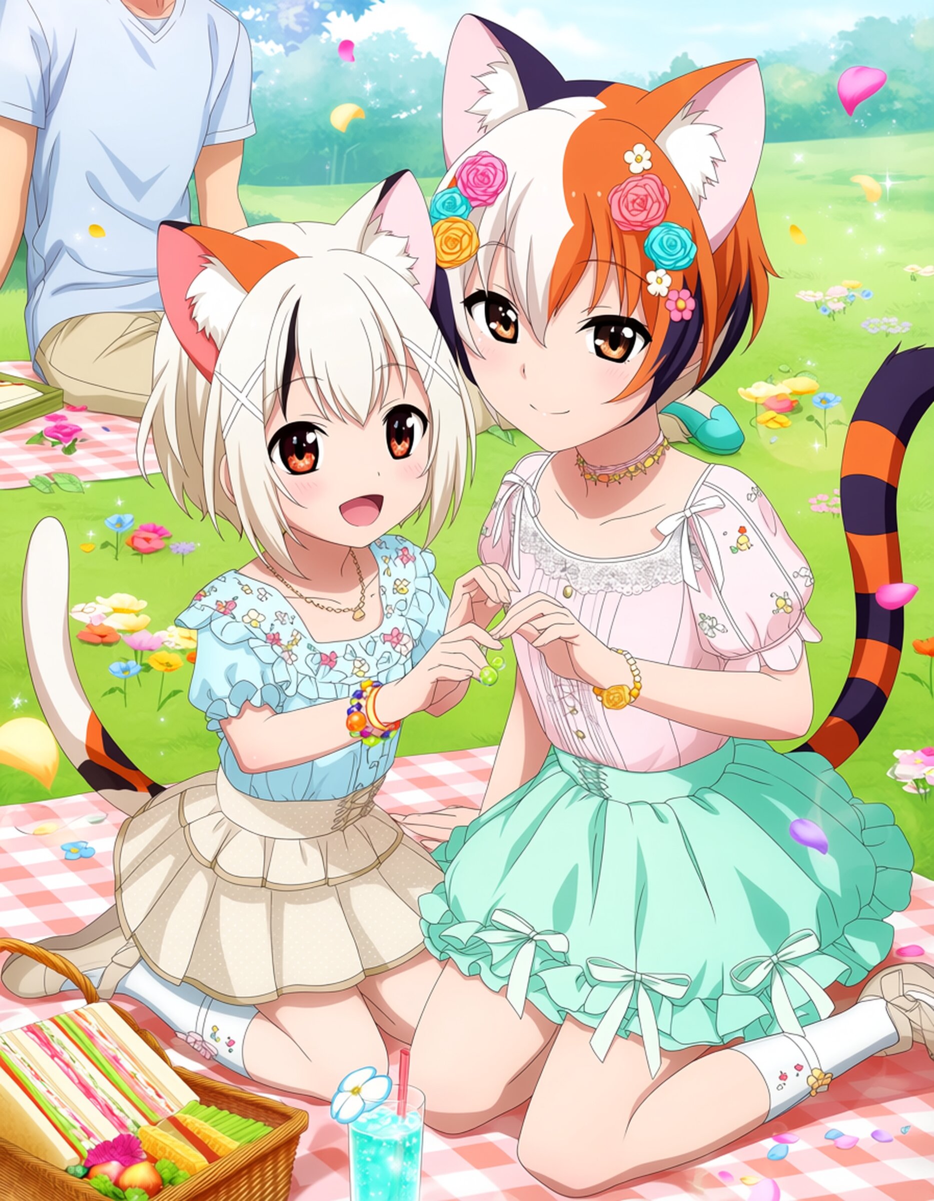 masterpiece, best quality, ultra-detailed, beautiful anime illustration, a petite small-statured anime girl with calico cat features as the main focus, small flat chest, innocent and adorable expression, large sparkling happy eyes, gentle joyful smile, soft blush, calico cat ears with white orange and black patches, fluffy calico cat tail swaying gently, hair with soft calico color streaks (white, orange, black), wearing a cute May spring picnic outfit: light pastel pink short puffy sleeve blouse with delicate flower embroidery, fluffy layered mint green and white skirt with small ribbon accents, white knee-high socks with tiny bows, comfortable light brown mary jane shoes, adorable accessories: large white ribbon on head, small colorful flower hairpins, delicate gold necklace with a tiny bell, colorful beaded bracelet, next to her: kind and gentle mother (beautiful adult woman with warm smile, wearing light floral blouse and beige skirt, comfortable flat shoes) and caring father (gentle adult man with soft expression, wearing casual light blue shirt and beige pants), family picnic together, celebratory and happy family atmosphere, joyful congratulatory mood, scene: family picnic in a soft outdoor spring garden in May, sitting on a checkered picnic blanket on the grass, picnic basket with sandwiches and fruits, light drinks, gentle warm breeze, many delicate flower petals floating and dancing gracefully around the family -- petals of azalea (pink and white), roses (soft pink), iris (purple and blue), poppies (light orange and pink), and nemophila (baby blue), petals swirling softly in the air, sparkling highlights on petals, light pink and white flower carpet on the ground, soft warm spring sunlight filtering through leaves, gentle volumetric lighting, beautiful subtle prism effects, soft dreamy light leak, delicate elegant lens flare that doesn't break anatomy, sparkling bokeh, floating petals creating a festive and warm family moment, dreamy yet vibrant atmosphere, high quality anime key visual style, sharp details, soft vibrant colors
