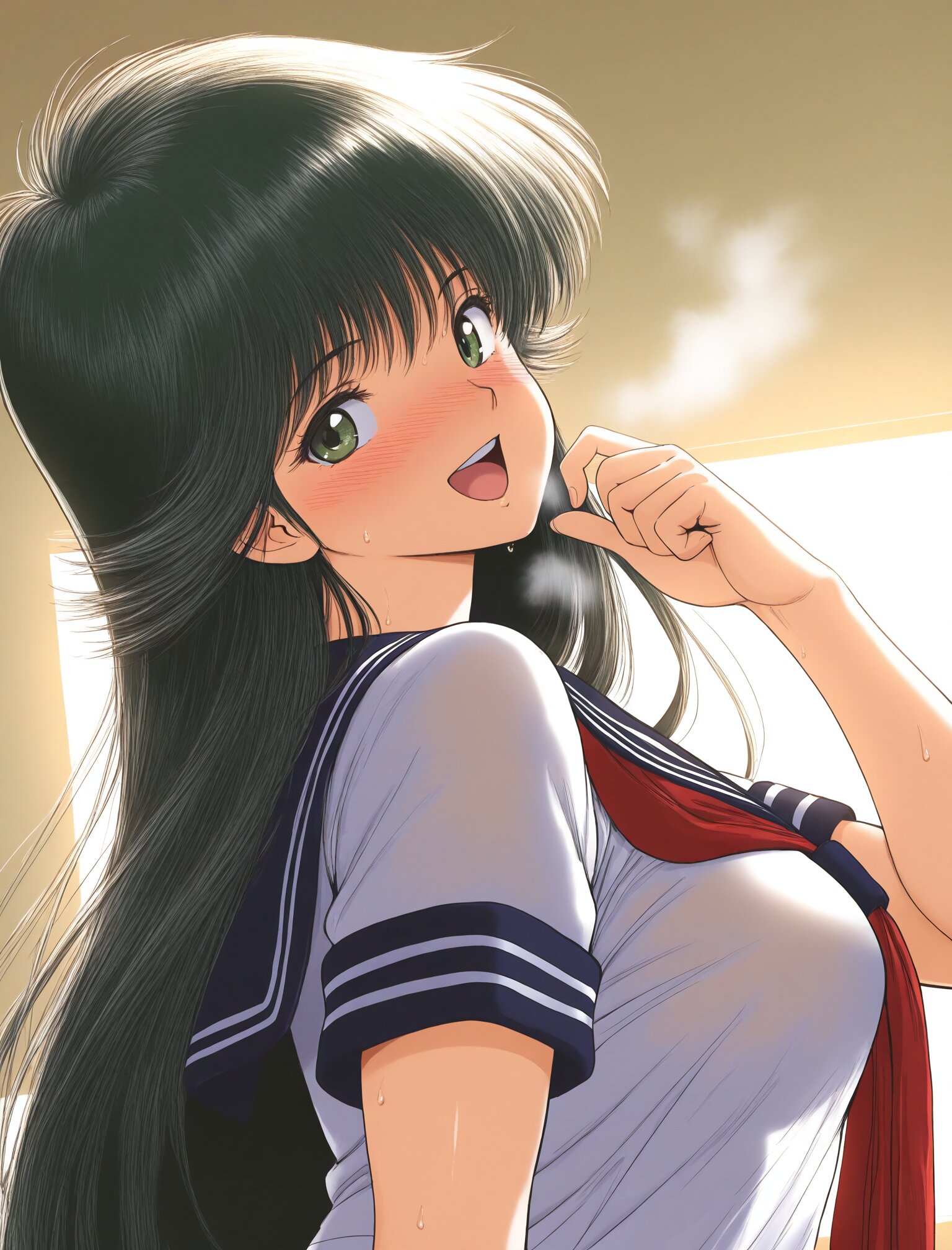 (solo),mdk_manga, green eyes,(from side),(upper body:1.5),sweat,(happy:1.4),(nose blush), (long dark green hair:1.3), thick bangs, glossy hair,(large breasts),(ayukawa madoka:1.3), (steam:1.5),(looking at viewer),(dynamic angle:1.4), (orgasm:1.5), (open mouth),(serafuku),(smile:1.3), glossy skin, specular highlights, studio lighting, rim lighting, masterpiece, best quality, ultra-detailed, 8k resolution, very aesthetic, <lora:StS-Illustrious-Detail-Slider-v1.0:2.> <lora:sdxl-hairdetailer_02:2> <lora:mdk_manga_illus_1024:0.8>