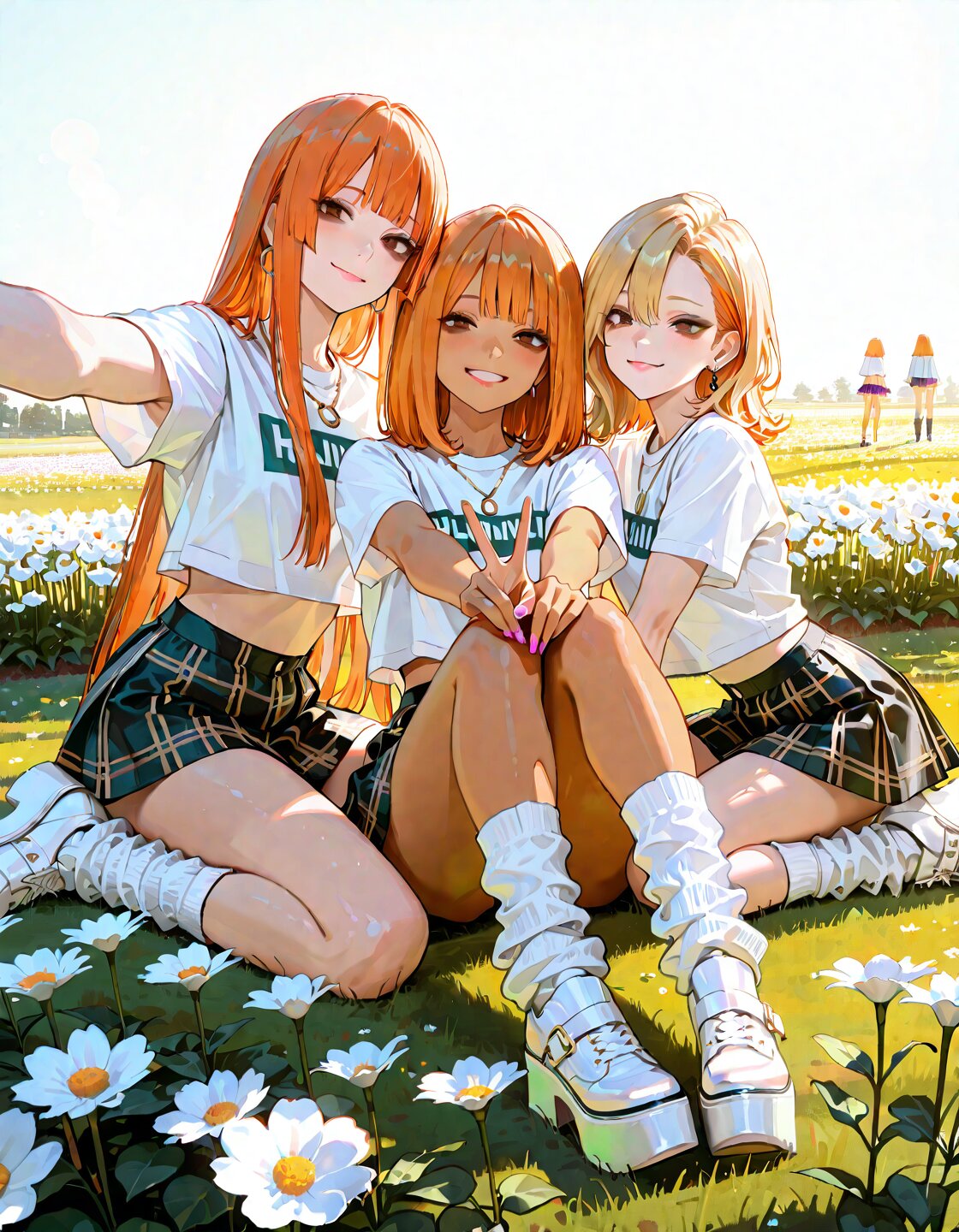 4Girls,Brown eyes,droopy eyes,(Orange hair),medium hair,straight hair,asymmetrical bangs,hime cut,silky hair,delicate face,delicate hair,beautifully detailed hair,defined detailed face,delicate facial features,beautiful detailed eyes,catchlight in eyes,detailed clothes,delicate fablic,subsurface scattering, soft light diffusion, (gyaru,tan skin with subsurface scattering, soft white eyeshadow on eyelids and under eyes, thin brown eyeliner:1.2), natural peach-orange blush on cheeks, glossy nude-pink lips, happy,cheerful,delightful,smiling,sitting on ground,Smile of joy,Dynamic pose,(gyaru V),selfie,Heartwarming Scene,cute,looking at viewer,