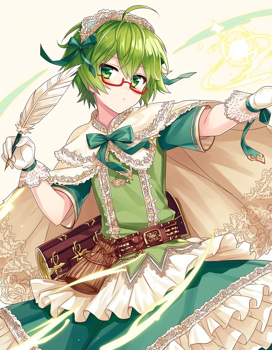 1boy, otokonoko, androgynous, cute face, slim body, flat chest, feminine features, short green hair, slightly tousled, ahoge, glossy hair, emerald green eyes, detailed eyes, red framed glasses, tsundere expression, slightly pouting, faint blush, looking at viewer with eyes only, face turned away, side glance, shy eye contact, fleeting gaze, reluctant but curious, suppressed smile, holding a quill pen, ink-stained fingers, sweet lolita fashion, frilly dress, lace trim, ribbons, frilled long tunic dress, lace collar cape, small headdress, bow on chest, lace cuffs, delicate gloves, fantasy illustrator outfit, medieval fantasy style fusion, leather belt with decorative pouches, scroll case on the back, dynamic pose, drawing glowing magic in the air, flowing fabric, wind effect, fantasy world, warm lighting, magical atmosphere, high detail, clean lineart, soft shading
