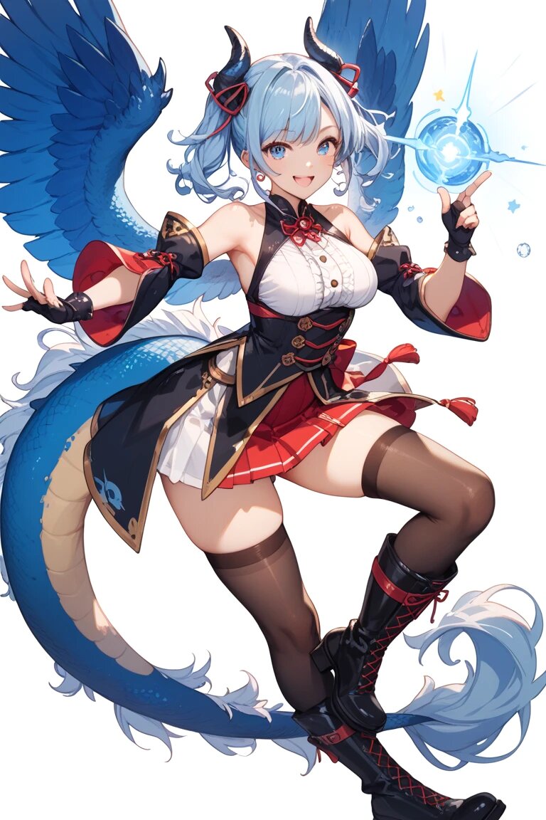 写真撮影用のスタジオ。 白い背景をバックに女性がポーズをとっている。 ドラゴンのコスプレをしている。 大きな羽根と大きな尾が生えたドラゴンのコスプレ。 ハイレグのドラゴンの着ぐるみを身に着けている。 ドラゴンの足の形のブーツを履いている。 迫力のある全身ポーズ。 可愛い笑顔。 撮影用のライトが女性を照らしている。