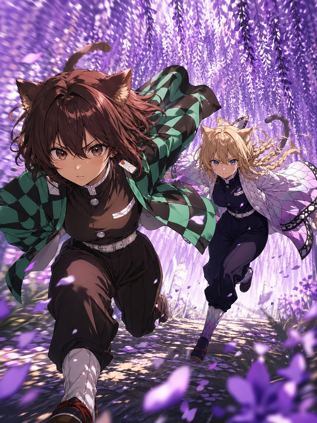 two girls, anime style, highly detailed, dynamic action scene, diagonal dash composition, split flow motion, brown eyes, chestnut brown hair, wavy bob hair, loose inward curls, hair between eyes, natural small cat ears, natural cat tail, medium breasts, blue eyes, long blonde hair, braid, hair between eyes, natural small cat ears, natural cat tail, medium breasts, cosplay mix, tanjiro inspired outfit, green and black checkered haori, dark brown uniform, simplified hanafuda earrings, shinobu inspired outfit, butterfly patterned haori, white to light purple gradient, dark inner outfit, light and elegant design, no hand holding, chasing composition, one slightly ahead leading, one following closely behind, strong forward motion, running pose, powerful step, forward leaning posture, hair and clothes flowing in same wind direction, wisteria flower tunnel, hanging purple blossoms, long wisteria strands, petals scattering in motion, petals and flowers stretched along motion direction, motion lines made from petals, wind flow from front to back, dynamic environmental interaction, low angle perspective, wide angle lens, strong perspective distortion, depth emphasized, foreground motion blur (flowers only), characters sharp focus, background slightly blurred for speed effect, cinematic lighting, sunlight filtering through wisteria, dappled light, soft glow, subtle rim light (slightly purple tint) on hair and edges, anime cel shading, hard shadows (2-3 tone shading), clean bold lineart, crisp edges, high contrast on focal point (faces and leading direction), extremely dynamic composition, sense of speed, dramatic motion, visually striking, masterpiece, best quality