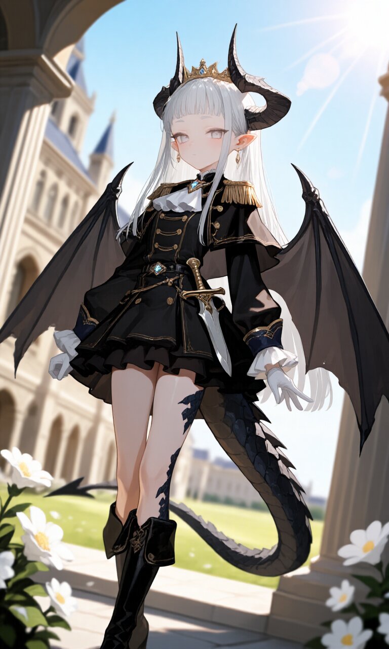 solo,1girl, a black dragon girl with white, straight long hair and short bangs, dragon horns on her head, light grey eyes, a delicate and expressionless cute face, and a skinny body. She has dragon wings on her back, a narrow waist, a dragon tail, and thin thighs and legs. Her arms and legs are covered in black dragon scales. She wears a (Black luxurious Prince costume:1.6) with long sleeves, a (luxurious Black Cape:1.3), a (luxurious Black mini skirt:1.4), (luxurious Black Boots:1.3), and (luxurious White gloves:1.3). She carries a (dagger on waist:1.3) and wears a (luxurious crown:1.4). The setting is a palace with Romanesque architecture, a romantic and classic academia atmosphere, outside with flowers in the afternoon. The scene is bathed in sunlight with lens flare, sunbeams, and shining light, against a blue sky. The style of the image is highly detailed and beautiful, with a 16k resolution, showcasing detailed skin, hair, and clothes.