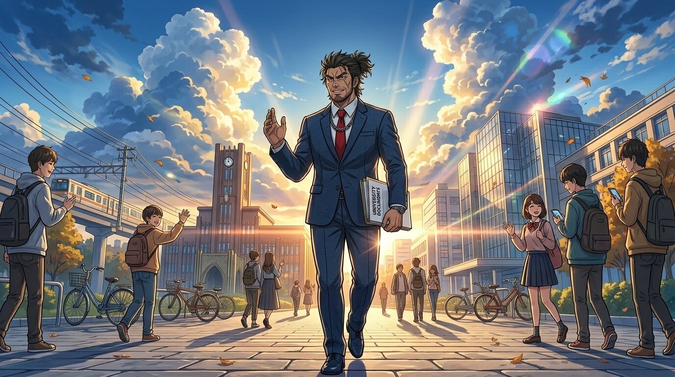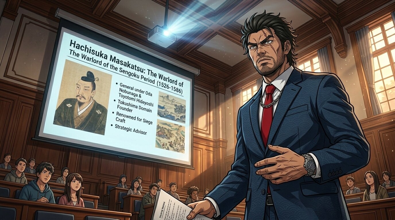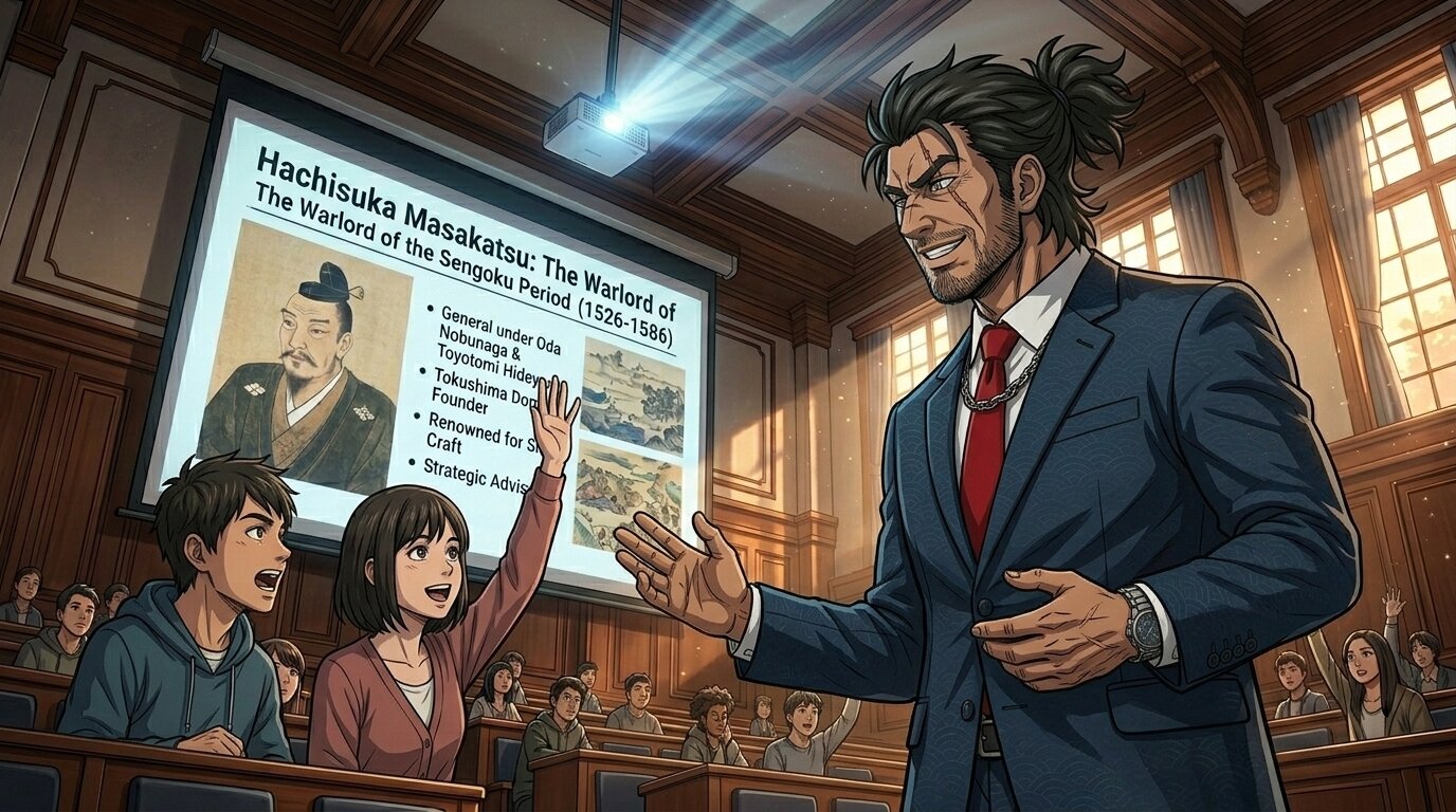 Manji (Business suit design study, ManjiFaceDetails.jpg) is shown with a serious expression, teaching in what appears to be a university classroom. A slide about the Sengoku period warlord Hachisuka Masakatsu is displayed on the screen behind him, suggesting a history lesson. Manji is drawn in Kyoto Animation Style, and the background is drawn in Makoto Shinkai Style. The composition is drawn in intense angle.