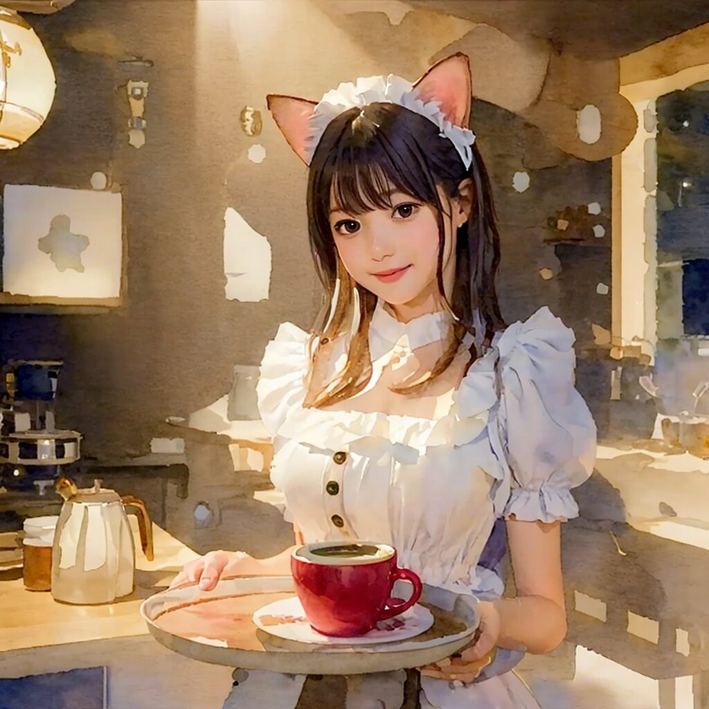 best quality, masterpiece, (watercolor painting:1.3), (line art:1.2), (illustration:1.0), (cel anime:1.2) Portrait, (face focus:1.6), (close up:1.4), soft lighting, soft shadow, (light on face:1.2), Backlighting, Golden Hour, slightly moving in the breeze, japanese, 1 cute girl, (large eyes:0.64), (medium breasts:1.1), bob, (smile:0.75), looking at viewer, Cafe, Frills and lace decorations maid:1.2, cat ears, maid, Espresso machine, coffee cups,