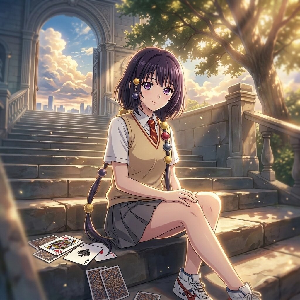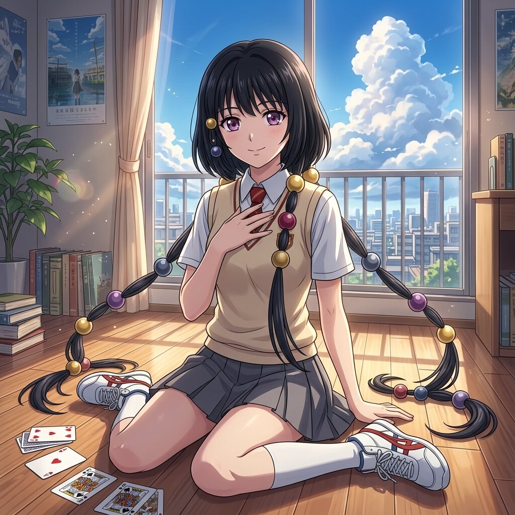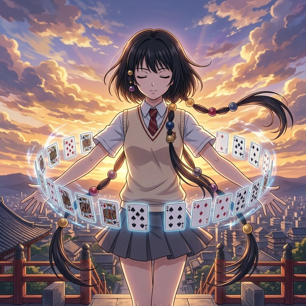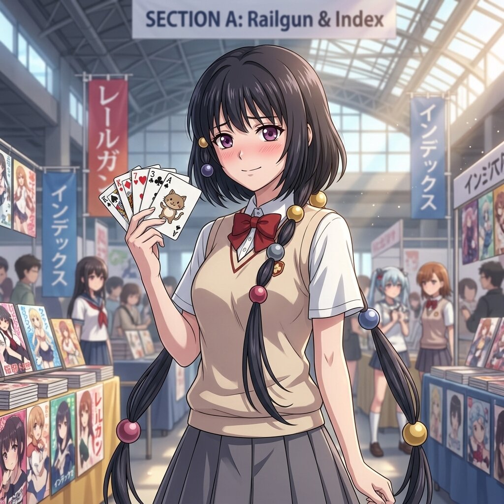 Ayaha (Anime girl character model,Anime girl face close-up,AyahaHairAccessories.jpg) Ayaha is photographed posing in cosplay as a character from "A Certain Scientific Railgun" at a doujinshi convention. She holds several playing cards in her right hand and has a slightly embarrassed expression. The background is drawn in Makoto Shinkai Style, and Ayaha is drawn in KyoAni style, with soft lighting and detailed eyes. The image is a waist shot with a dynamic angle. A direct frontal composition was avoided.