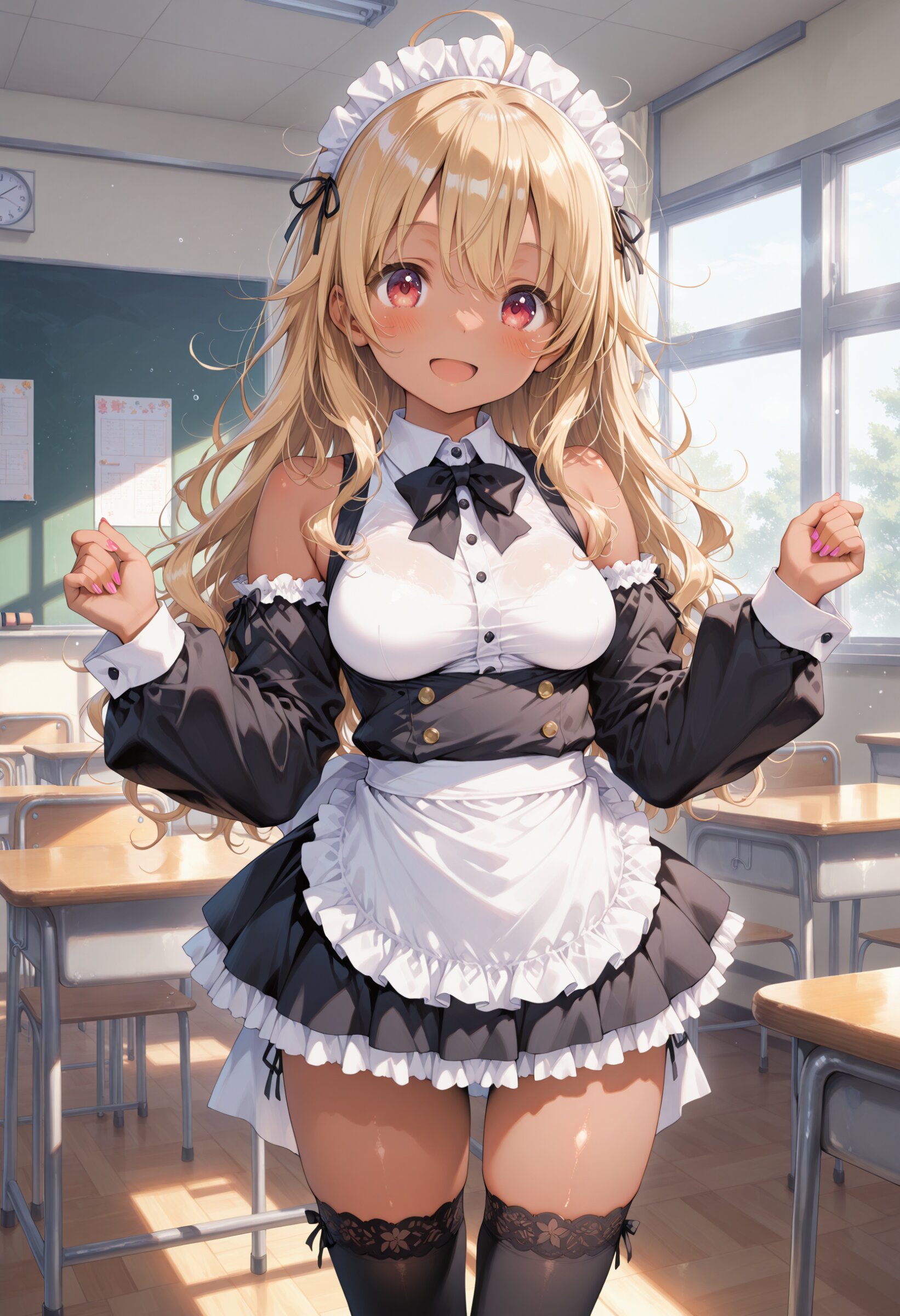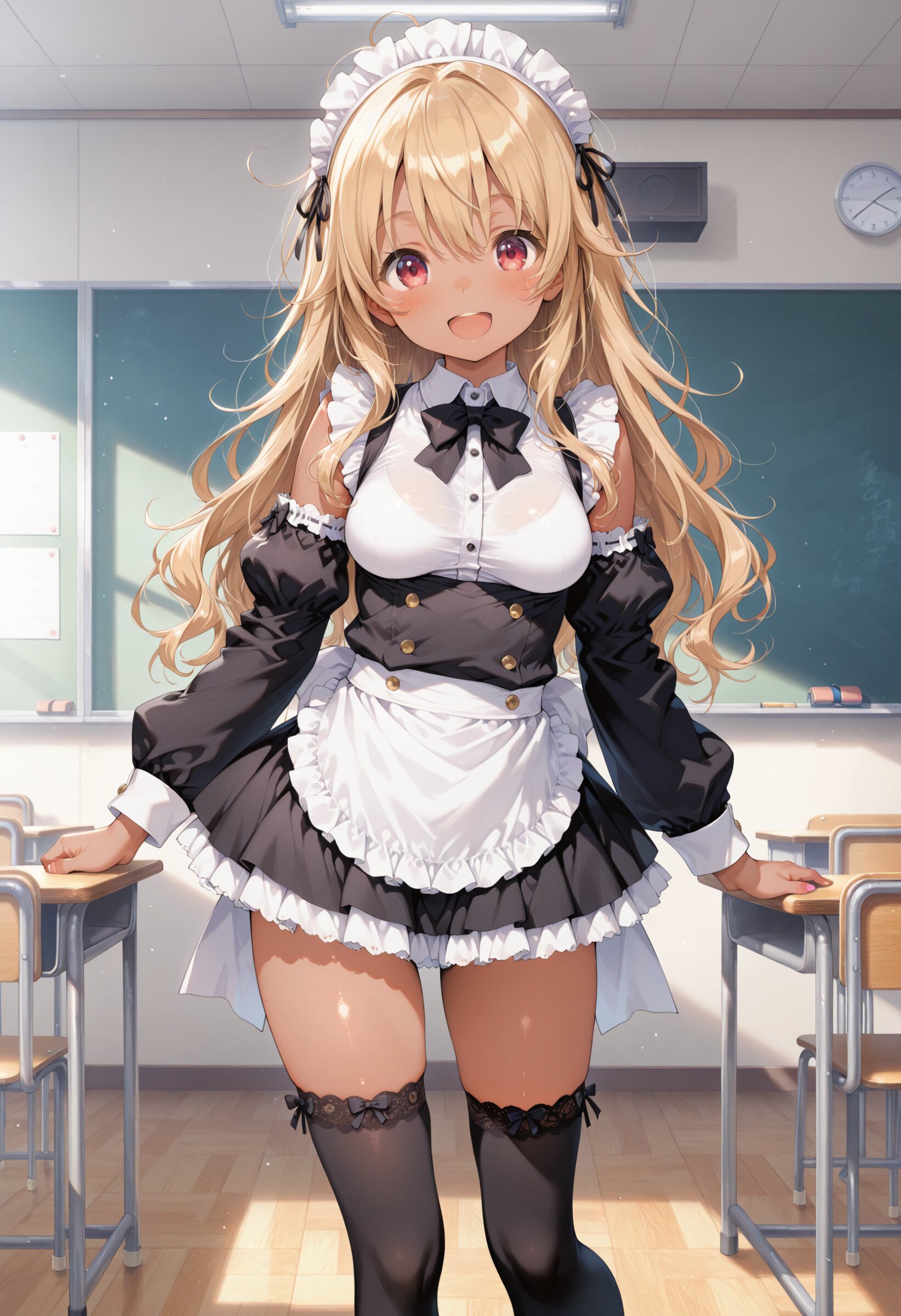 masterpiece, best quality, amazing quality, general, fine detail, official art, 1girl, loli, petite, gyaru, (tanned skin:1.2), blonde hair, messy hair, maid costume,, miniskirt, black thigh-high socks,detached sleeves, , beautiful legs, medium breasts, impossible clothes,, classroom, happy, festival,