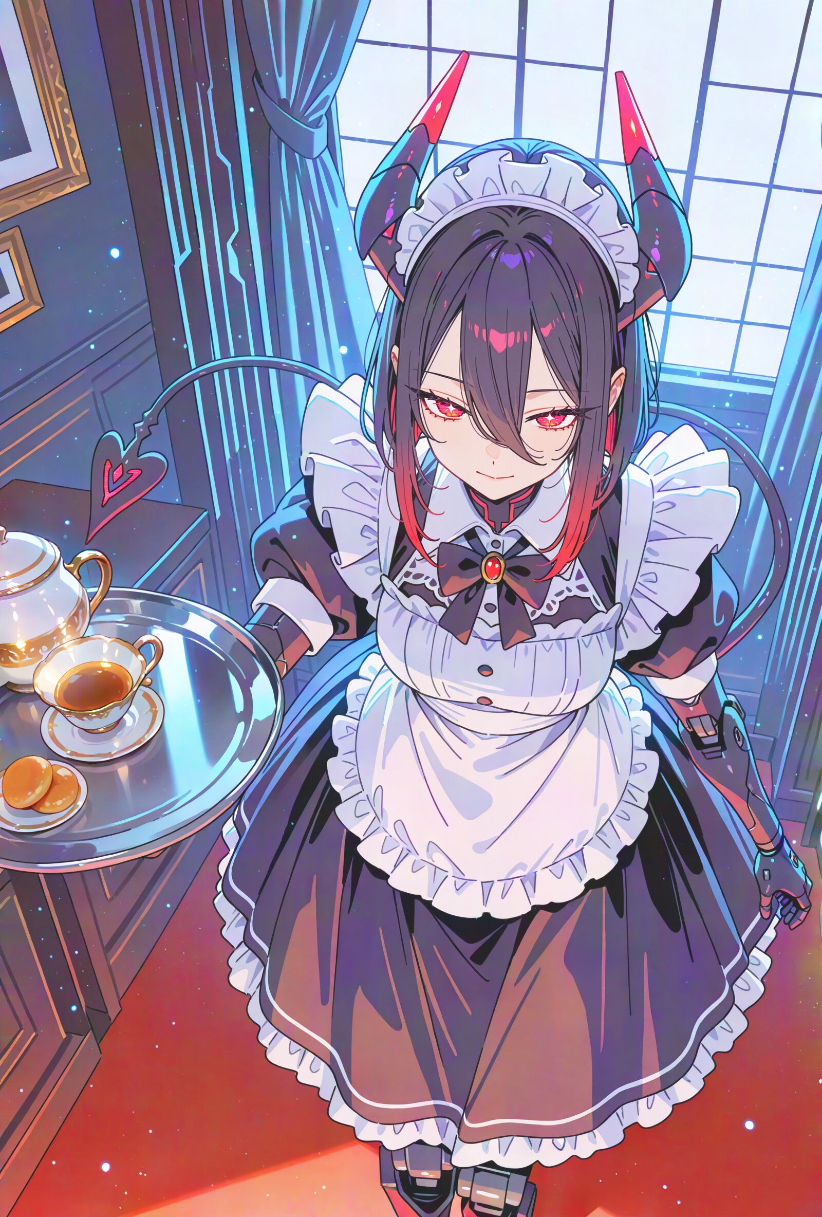 (portrait:1.2) (from above,looking up:1.2) looking at viewer, maid cafe, cyberpunk, An android woman works at a maid café. The café has a fantasy theme where she works as a classic maid, pretending to be a demon from a fictional country. indoor, A modern design with a sharp impression The space is white-based and sophisticated Simple interior style, Step inside and you’re transported into a world fit for a traveller White lace curtains serve as dividers, round window, (white lace curtains:1.0), creating intimate spaces, illuminating the meticulously crafted space meticulously crafted. maid, pale skin, black hair, medium hair, husky hair, long bangs, red eyes, (beautiful x-shaped pupils:1.0), (intricate mechanical legs:1.2), prosthetic hands,, mechanical arms, short sleeves classic maid uniform, black bowtie, long skirt, maid headdress, maid apron, demon horns, demon tail, , empty eyes, seductive smile, , half closed eyes, closed mouth, outstretched arm, mechanical tail, beautiful hoagie on plate on tray super fine concept art, hard surface, graceful eyes, masterpiece, best quality, amazing quality, very aesthetic, absurdres, newest, professional art lots of details, , overexposure, sumie effect style, 4ur4_illu,shiny, glowing, glowing particles, glowing light particles, light particles, , <lora:noline (1):0.0> <lora:sdxl2-flat2-512b:0.2> <lora:facelightup_xl_v10:0.5> <lora:V2_yakumo_alchemy:0.5> <lora:Aura_illu:0.1>