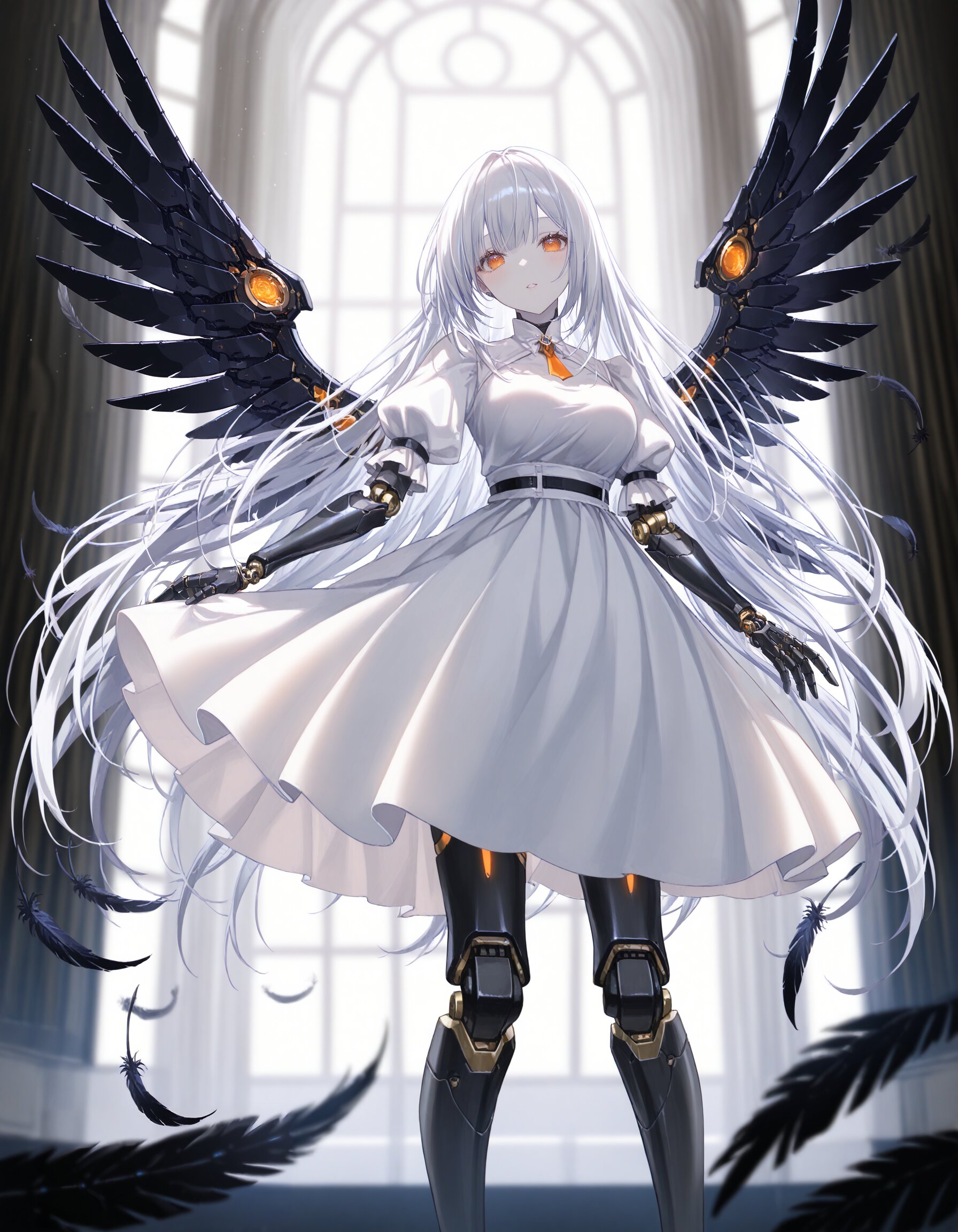 masterpiece, best quality, amazing quality, very aesthetic, high resolution, ultra-detailed, absurdres, newest, scenery BREAK 1girl, solo, ghost girl, silver hair, long hair, pale skin, orange eyes, android, robot joints, mechanical arms, mechanical legs, mechanical feathers, mechanical feathered wings, white dress, pleated dress, puff sleeves, decorative embroidery BREAK solo focus, depth of field, volumetric lighting