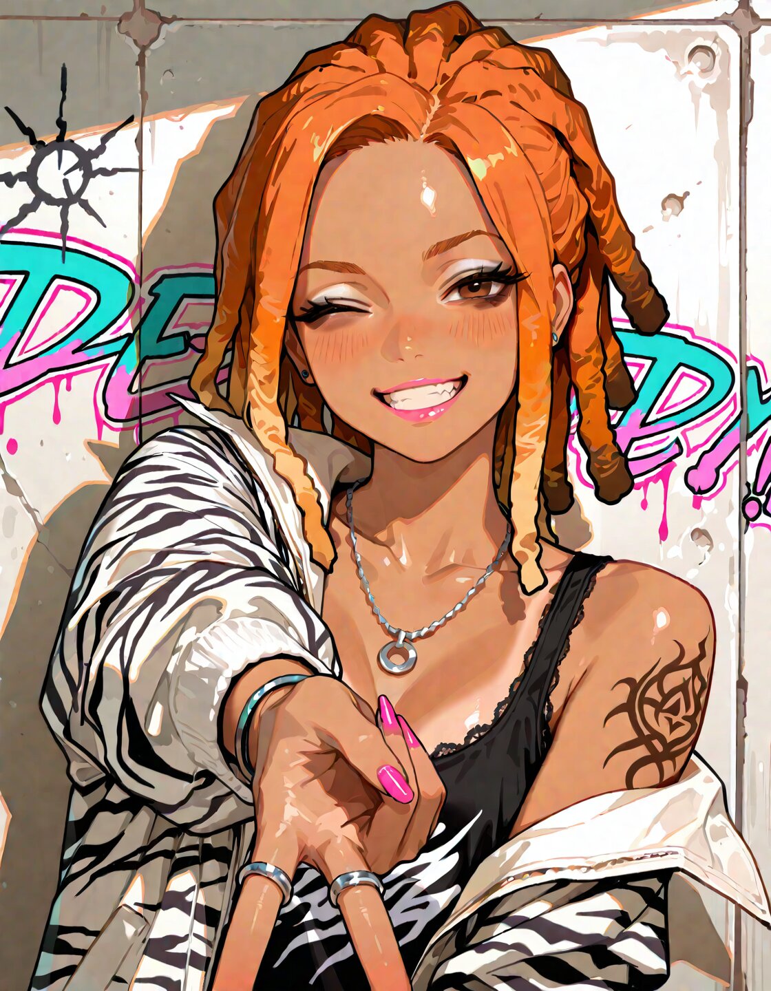 solo,Brown eyes,droopy eyes,Orange hair,(dreadlocks:1.5),delicate face,detailed hair,defined detailed face,delicate facial features,beautiful detailed eyes,catchlight in eyes,detailed clothes,delicate fablic,subsurface scattering, soft light diffusion, gyaru,tan skin with subsurface scattering, soft white eyeshadow on eyelids and under eyes, thin brown eyeliner, natural peach-orange blush on apples of cheeks, glossy nude-pink lips,tattoo, happy, joyful, cheerful grin,smug,one eye closed,cute pose,dynamic pose,(gyaru V:1.3), hip-hop,streetwear, black lace-trimmed tank top, zebra print jacket, long sleeves, loose clothes, single bare shoulder, collarbone,silver Rugged necklace,silver pierces,thick rings, masterpiece, best quality, insanely detailed, highly detailed, intricate, detailed eyes, beautiful eyes, beautiful face, beautiful hair, beautiful, 16k, photorealistic, urban graffiti-covered wall,upper body,in the style of psychedelic overload, art academia, cold lighting