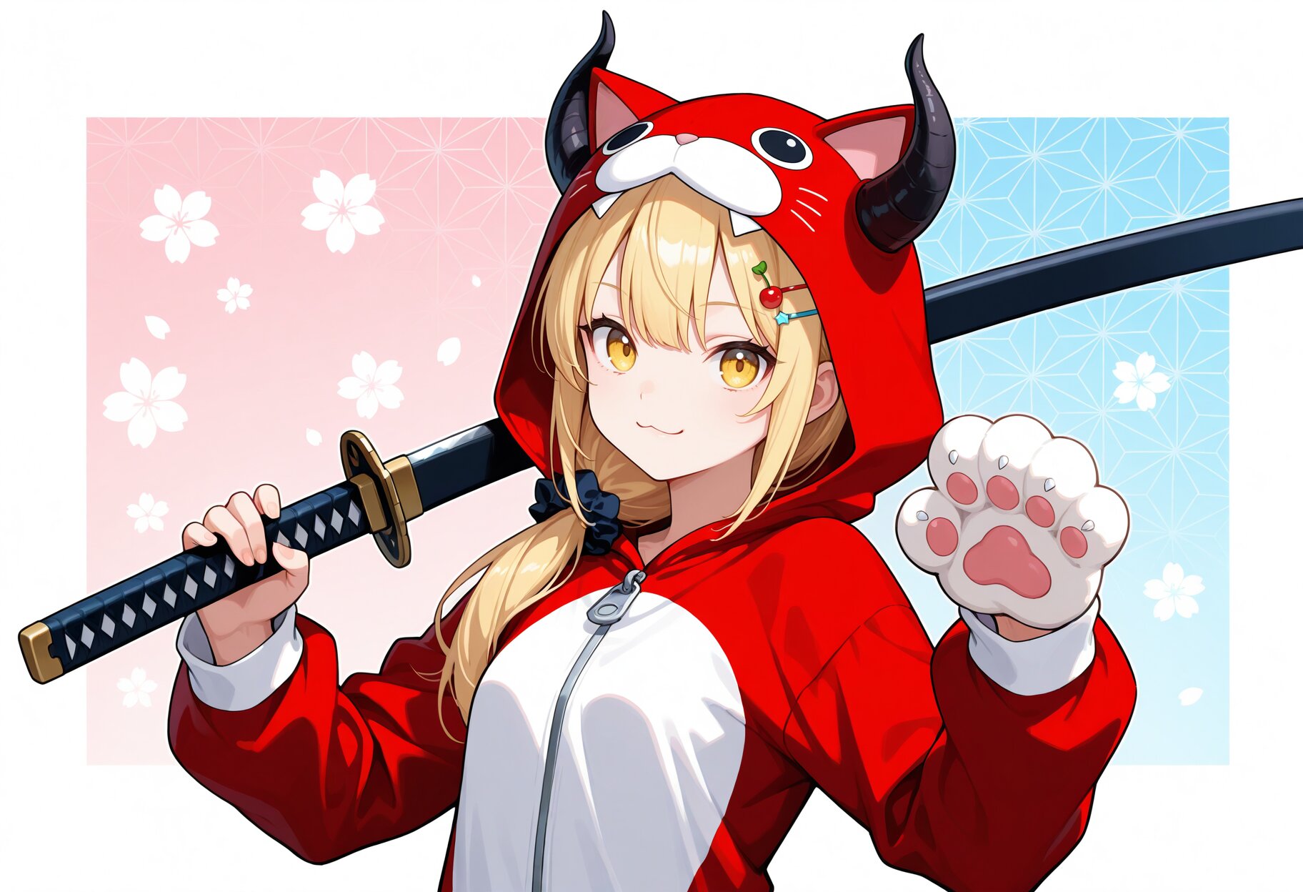 masterpiece,best quality,highres,ultra detailed,highly detailed,detailed eyes,perfect anatomy,general,1girl,solo,17yo,cute,(two demon horns,black horns,low ponytail),demon girl,small breasts,blonde hair,long hair,bangs,hair scrunchie,colorful hairclip,yellow eyes,smile,:3,(kigurumi,cat clothes,cat kigurumi,animal hands),slender girl,BREAK holding sheath,over shoulder,looking at viewer,upper body,fantasy,cherry blossoms patterned background,paw pose,katana,