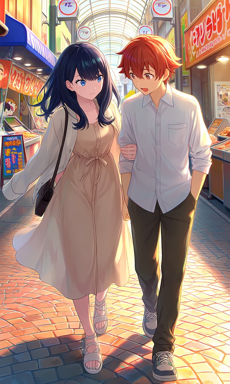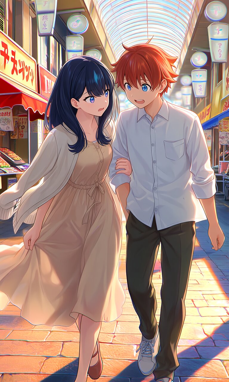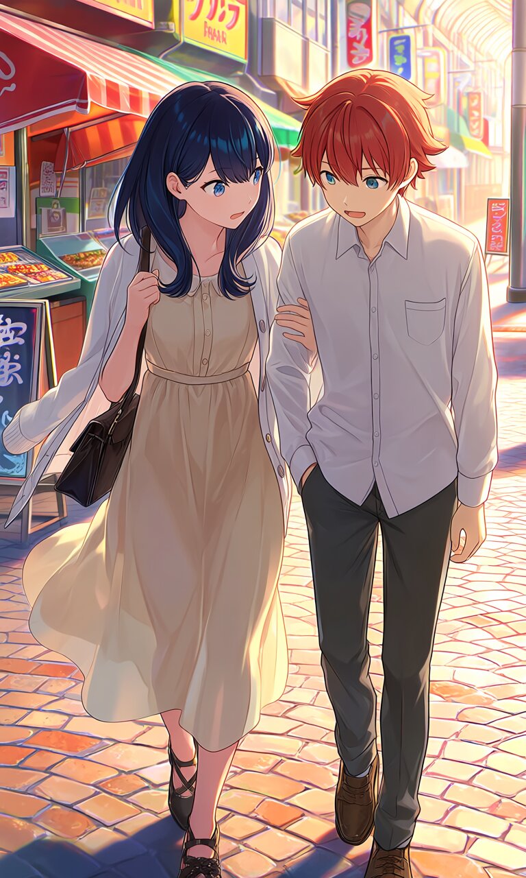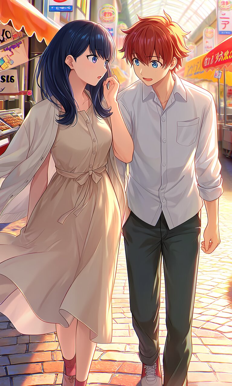 Couple, boy and girl, two people only,absurdres, ultra-detailed, master piece, high resolution, 8k, Boy, girl, couple, A couple walking home through Kurashiki shopping street during golden hour, late afternoon sunlight painting the stone pavement in amber and orange hues, the girl in a pale beige sundress with a light cardigan draped over her shoulders, the boy in a crisp button-up shirt and chinos, food stalls from the closing Sanzai market visible in the background, their satisfied expressions after a day of exploring, intimate atmosphere with long shadows stretching across the retro arcade walkway, warm cinematic lighting, gentle breeze catching the hem of her dress BREAK the boy(hibiki yuuta ) BREAK the girl(takarada rikka ),