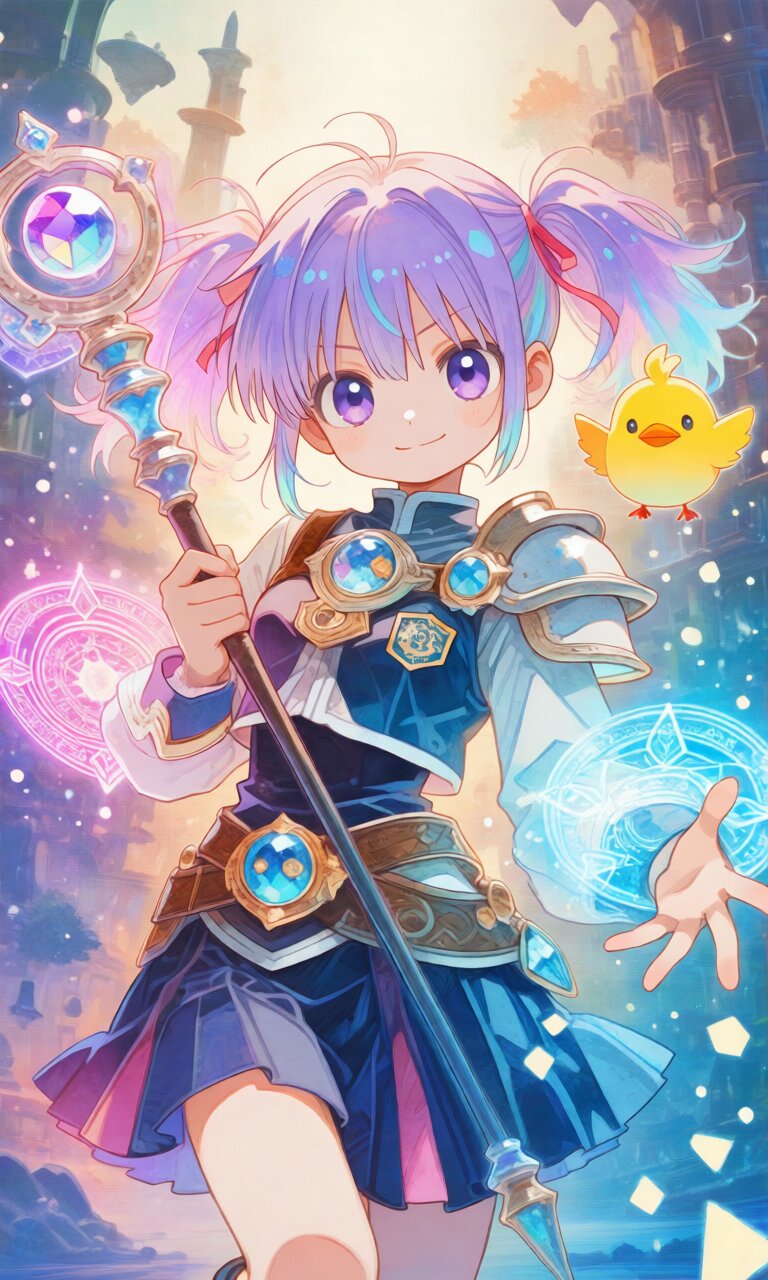 masterpiece, best quality, ultra detailed, highres, 1girl, solo, geometric aesthetic, fantasy RPG heroine, twintails, hair ribbon, light purple hair, multicolored streaked hair, gradient hair, purple eyes, big eyes, tsurime, cute face, fair skin, petite, slender, stylized fantasy outfit inspired by school uniform, blouse, skirt, decorated armor parts, light armor, magical accessories, floating geometric magic circles, glowing sigils, polygonal effects, holding a magical staff or summoning magic, energy particles, confident smile, heroic expression, slightly playful, fantasy world background, ruins or magical city, floating structures, small yellow chick as magical familiar, glowing slightly, dramatic fantasy lighting, soft glow, rim light, depth of field, clean linework, anime style, highly detailed, cinematic composition