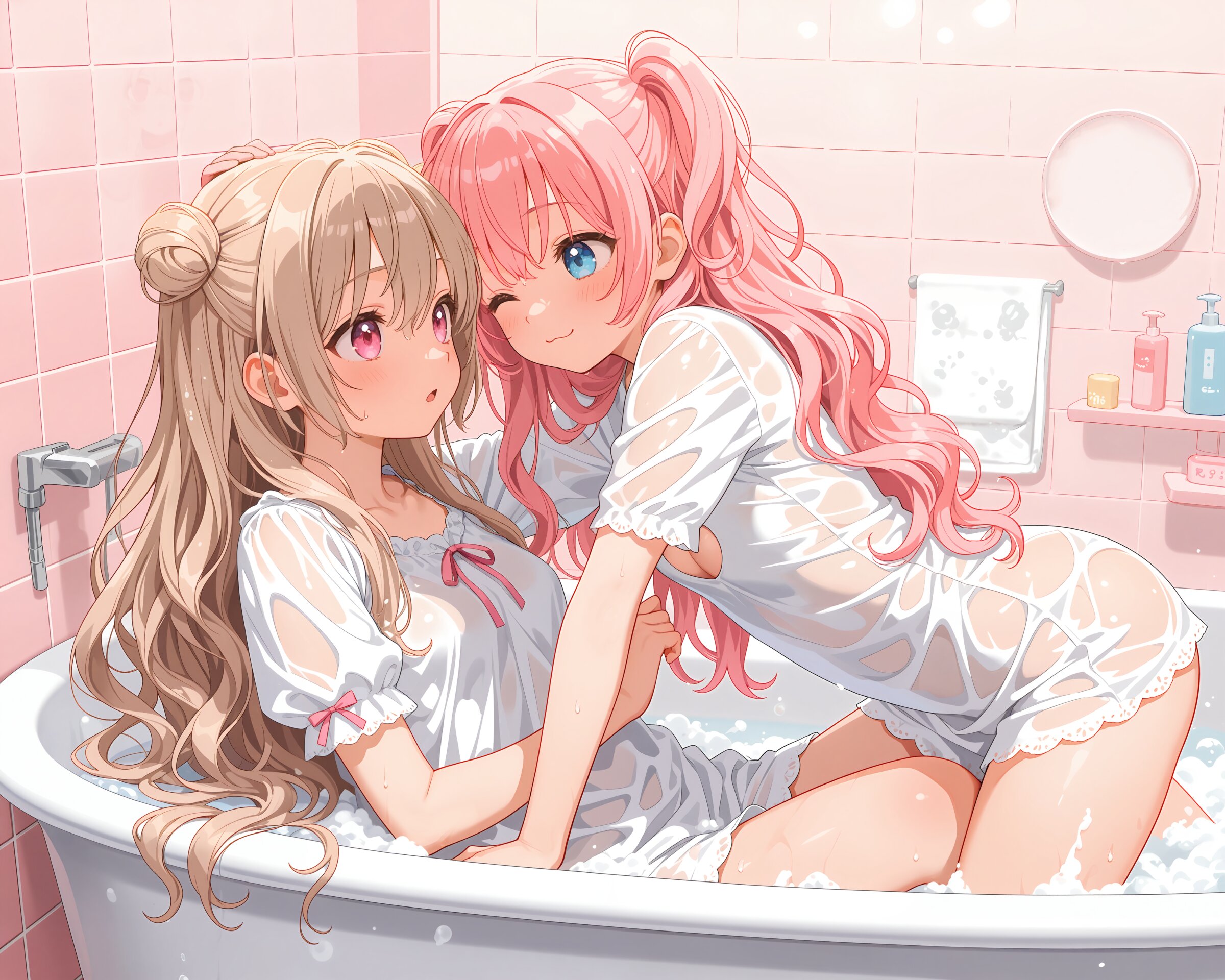 // これは自作Workflowの4つあるプロンプト欄それぞれに入れたプロンプト // common / prepend 2girls, yuri couple, colorful, looking at another, from side, very wide shot, bathing, bathtub, bathroom, body soaping, soap bubbles, convenient censoring, leaning forward, hand on own head, clothes cutout, tiles, // region 1 (cute girl, pink eyes, cute eyes, large eyes, pink ribbon, light brown hair, medium long wavy hair, two small buns, bangs between eyes, bobby pin, small breasts), (thick thighs:0.8), blush, :o, (wet clothes:1.2), (wet body:1.2), (wet hair:1.2), // region 2 (cute girl, blue eyes, cute eyes, large eyes, blue ribbon, pink hair, long wavy hair, two side up, bangs, small breasts), (thick thighs:0.8), blush, :3, one eye closed, (wet clothes:1.2), (wet body:1.2), (wet hair:1.2), // common / append clean lineart, clear silhouette, masterpiece, best quality, newest, absurdres, highres, very awa,