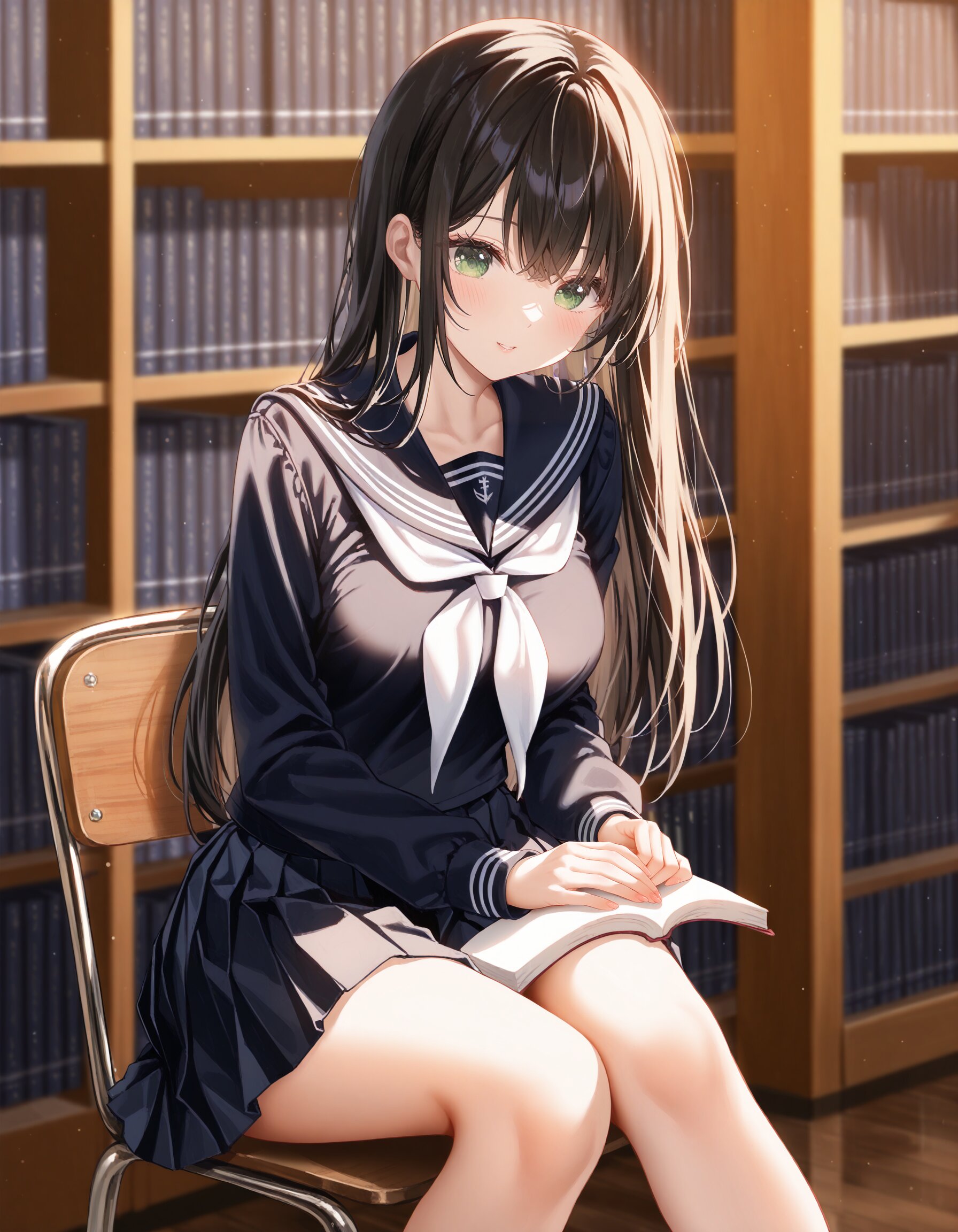 masterpiece, best quality, amazing quality, very aesthetic, high resolution, ultra-detailed, absurdres, newest, scenery BREAK 1girl, solo, black hair, long hair, straight hair, green eyes, medium breasts, smooth skin, sitting, hugging book, school uniform, black serauku, long-sleeved, white neckerchief, black pleated skirt BREAK library, chair, depth of field, volumetric lighting