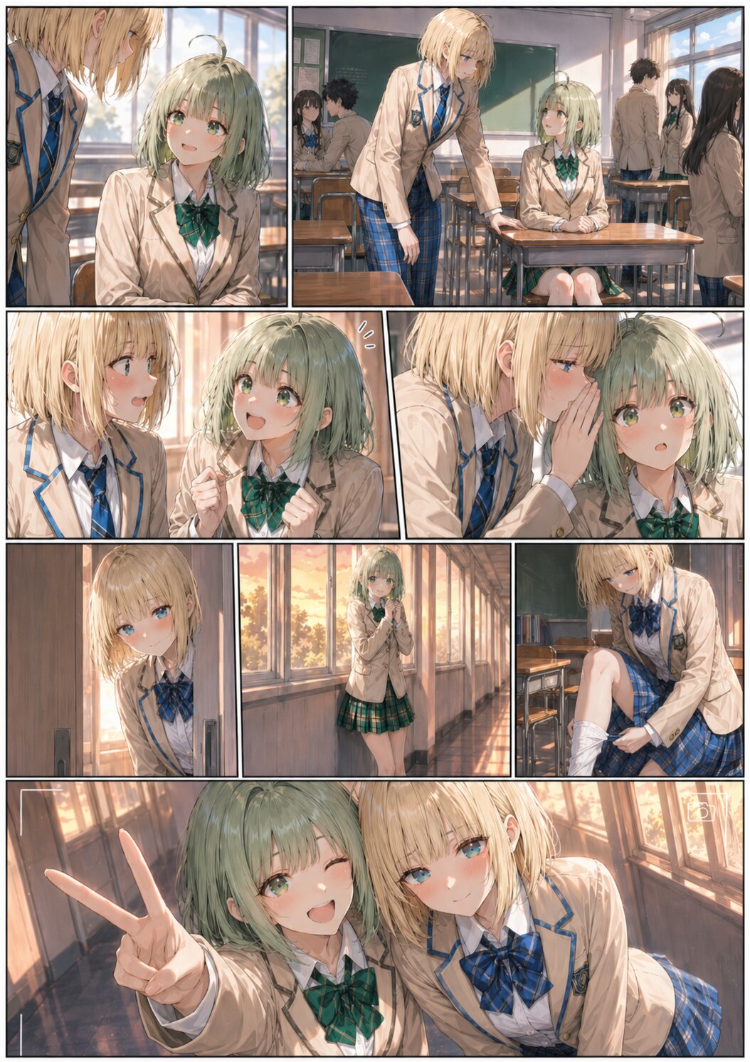 放課後、夕陽の射す教室、ドキドキしながら青いチェックのスカートに片足を通すブルー、廊下で窓際にもたれて待つグリーン