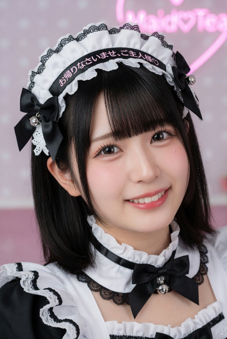 メイド喫茶のメイドである日本人女性24歳のリアルなフォト。スタジオにてプロのカメラマンによる撮影のような仕上がり。肩から上で顔にクローズアップした画角。視線は撮影者へ。