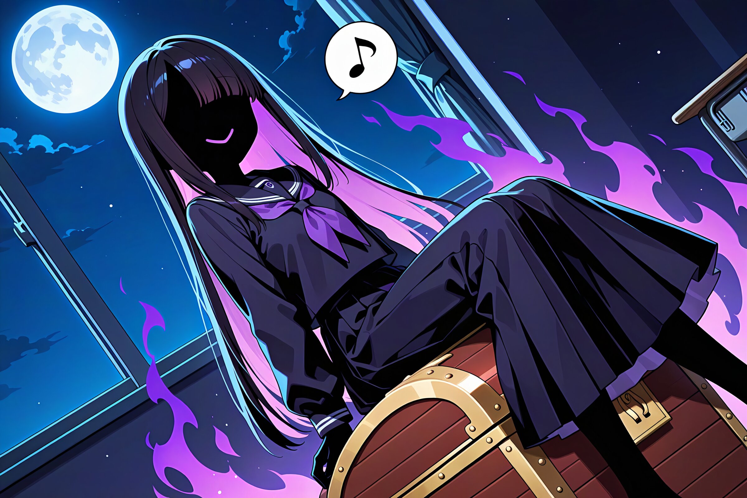 1 little girl, solo, diagonal angle, masterpiece, best quality, amazing quality, very aesthetic, shadow girl, (shadow face:1.5), shadow skin, shadow hair, long hair, straight hair, asymmetrical bangs, no ears, no eyes, no nose, closed mouth, smile, spoken musical note, shadow serafuku, purple neckerchief, sitting on mimic chest, fliphair, dark aura, night, classroom, moon,