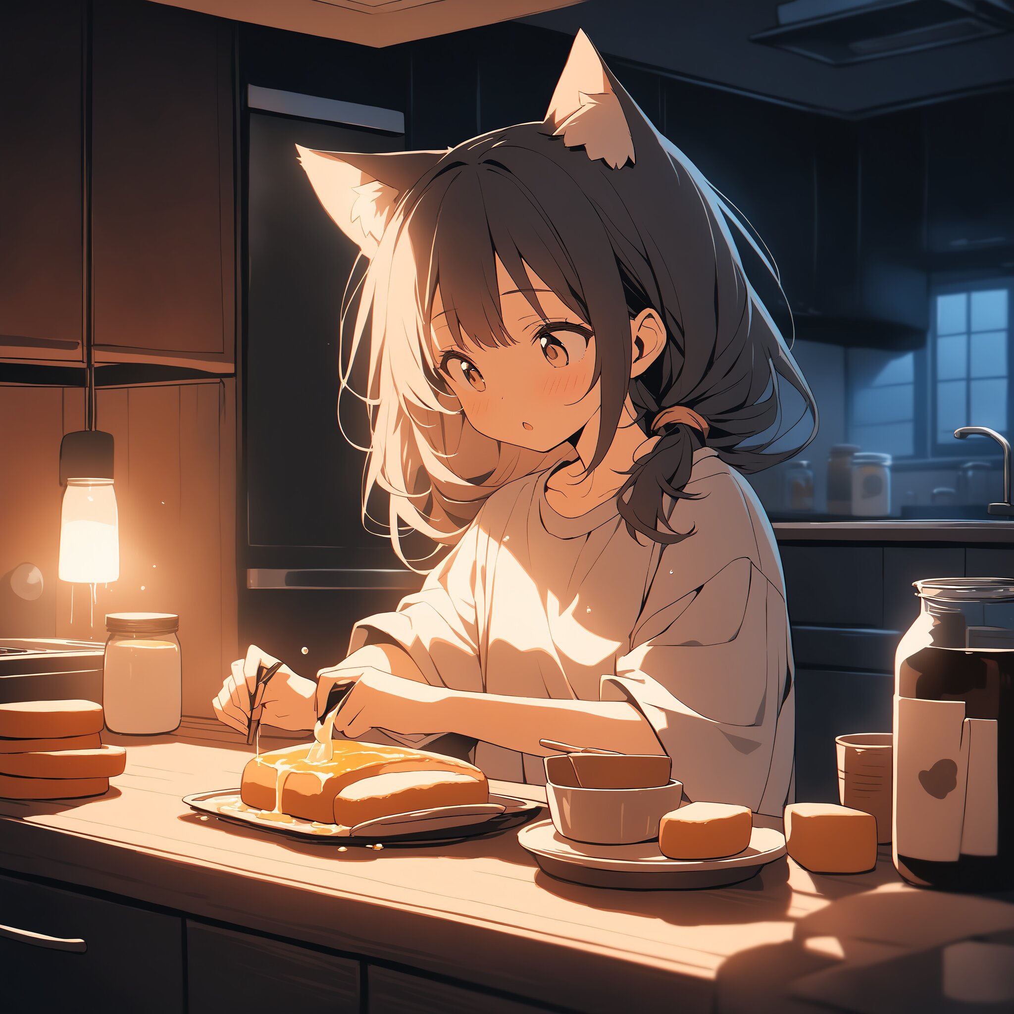 Masterpiece, lo-fi aesthetic, a cat-eared girl preparing a late-night snack in a cozy kitchen. She is wearing an oversized t-shirt and carefully pouring milk into a glass. A warm light from a small kitchen lamp provides the main light, casting long, soft shadows on the wooden counter. A loaf of bread and a jar of honey are visible nearby. Her cat ears are twitching slightly, matching her messy but cute hair. Quiet and domestic atmosphere, dimly lit kitchen background, cinematic lighting, intricate details of steam and textures, 8k.
