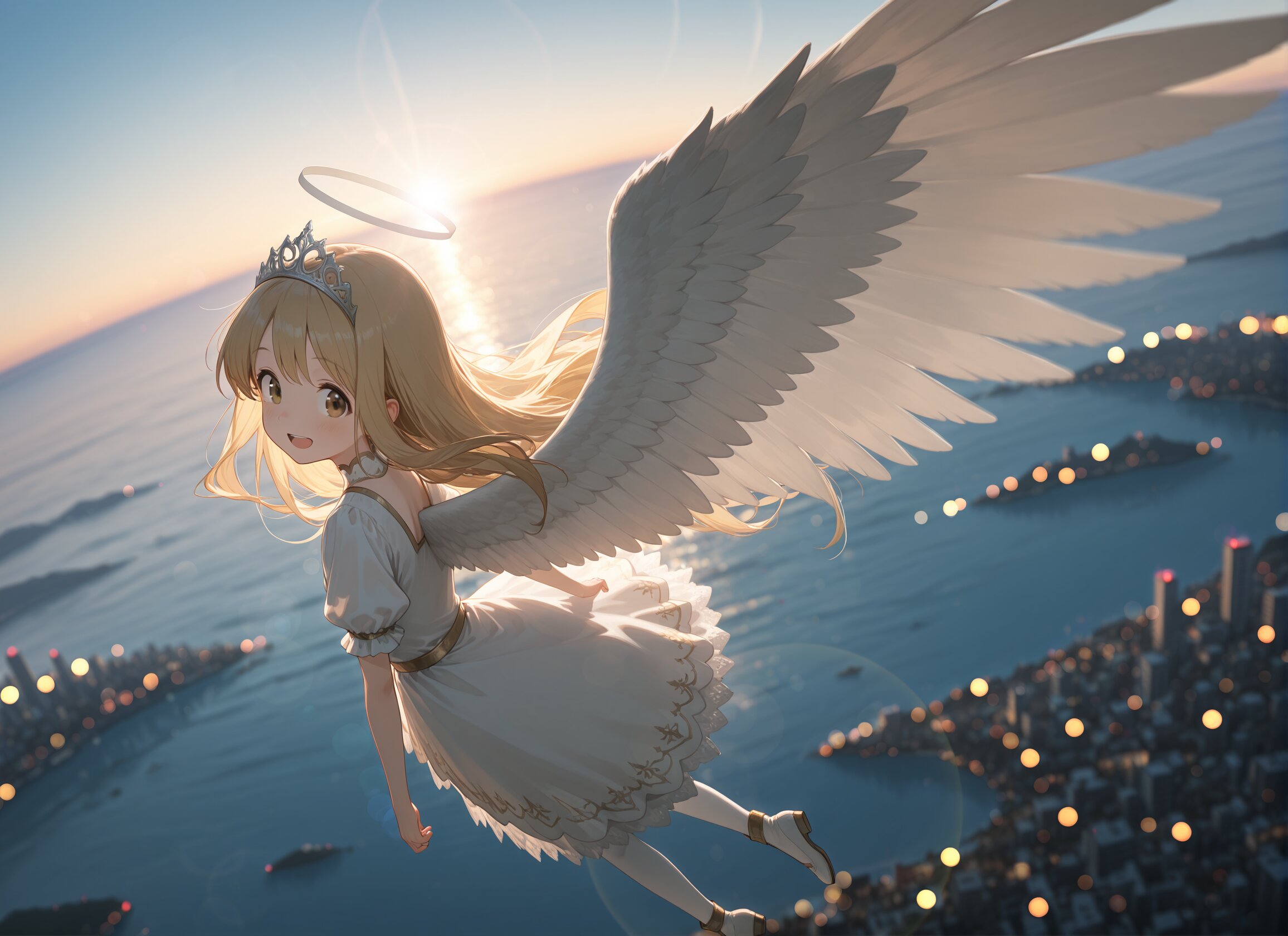 masterpiece, best quality, absurdres, 8k, ultra detailed, aesthetic, very aesthetic, newest, <lora:Fixhands_anime_bdsqlsz_V1:0.5>, <lora:bold-16oa:-0.5>, BREAK (bokeh,shallow depth of field,Gaussian Blur,lens flare:1.6), ocean,horizon,cityscape,(blonde hair, long hair, brown eyes, smile,tareme,open mouth,white angel wings,tiara:1.1),sky,cityscape, tokyo,looking at viewer,(perspective,cinematic lighting:1.1), (fullbody shot,side view:1.1),(fullbody shot:1.3),dynamic pose,motion blur,(tiara,halo:1.2),<lora:USNR STYLE_XL_loha:0.45><lora:flat_sdxl:-1.2>