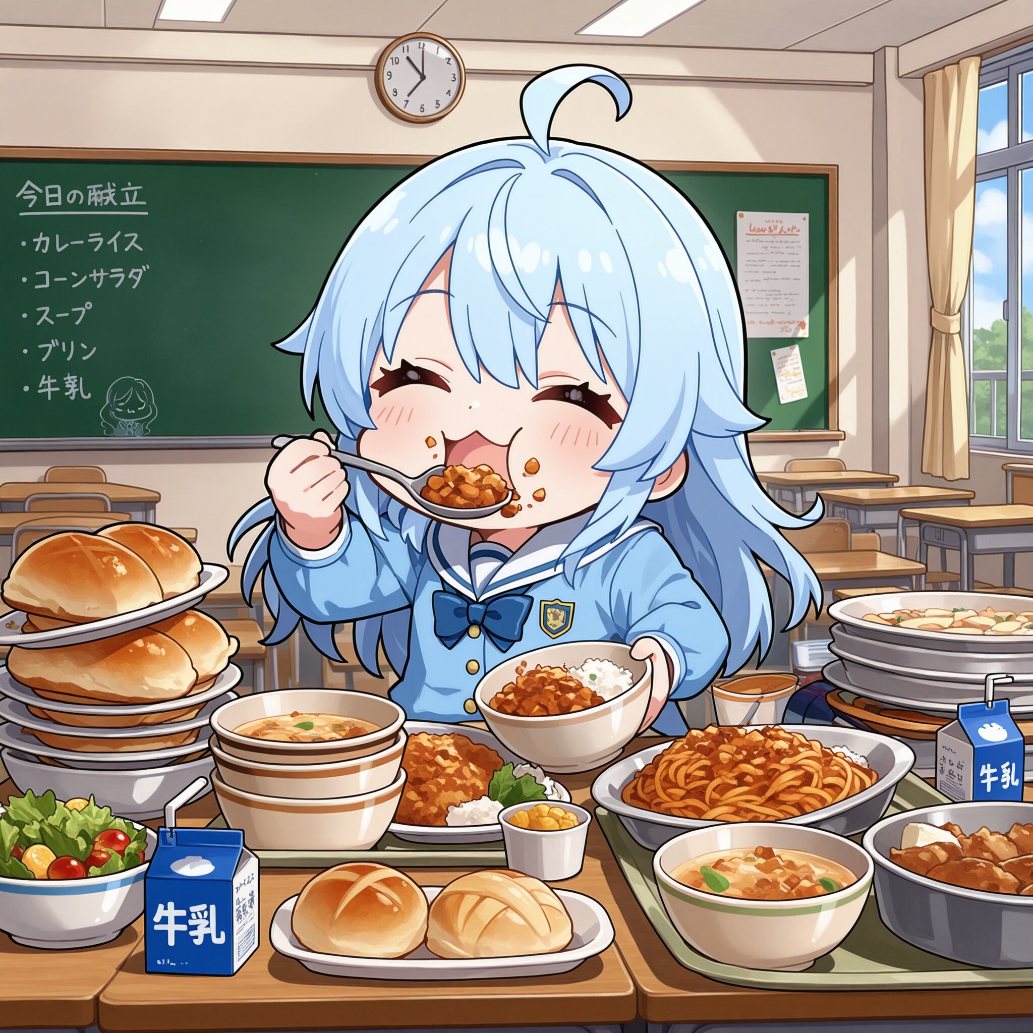 comical and deformed illustration,flat painting,daytime,classroom,many foods on desk,1girl,solo,chibi,light blue hair long hair,ahoge,happy smile,closed eyes,:3,:t,school uniform,(eating school lunch),((masterpiece, best quality, extremely detailed, absurdres)),