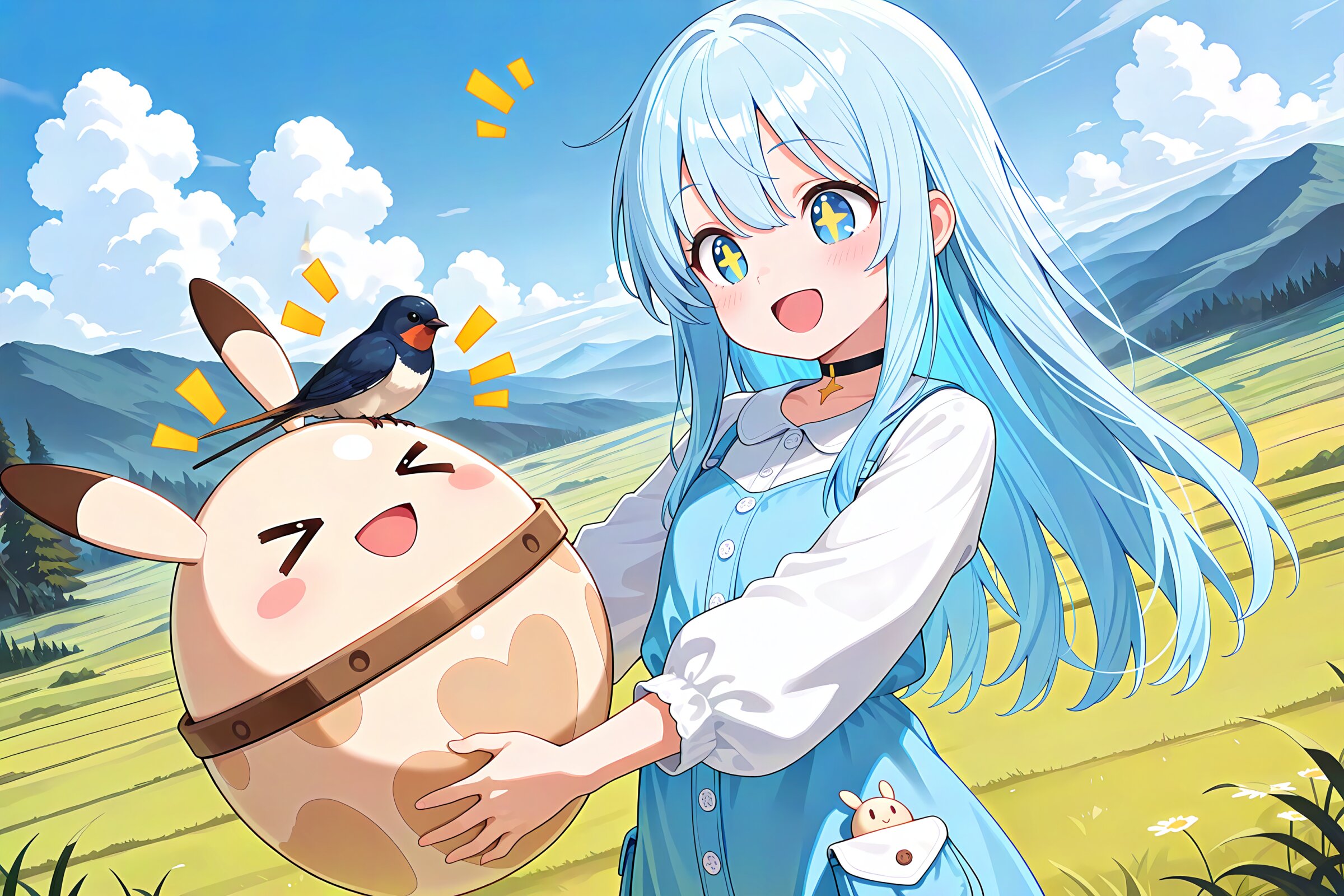1 little girl, solo, diagonal angle, masterpiece, best quality, amazing quality, very aesthetic, sky blue hair, long hair, straight hair, blue eyes, +_+, open mouth, smile, cheerful, +++, notice lines, choker, spring outfit, long sleeves, holding humpty dumpty, > <, blue tree swallow on head, sparrow, outdoors, highland,
