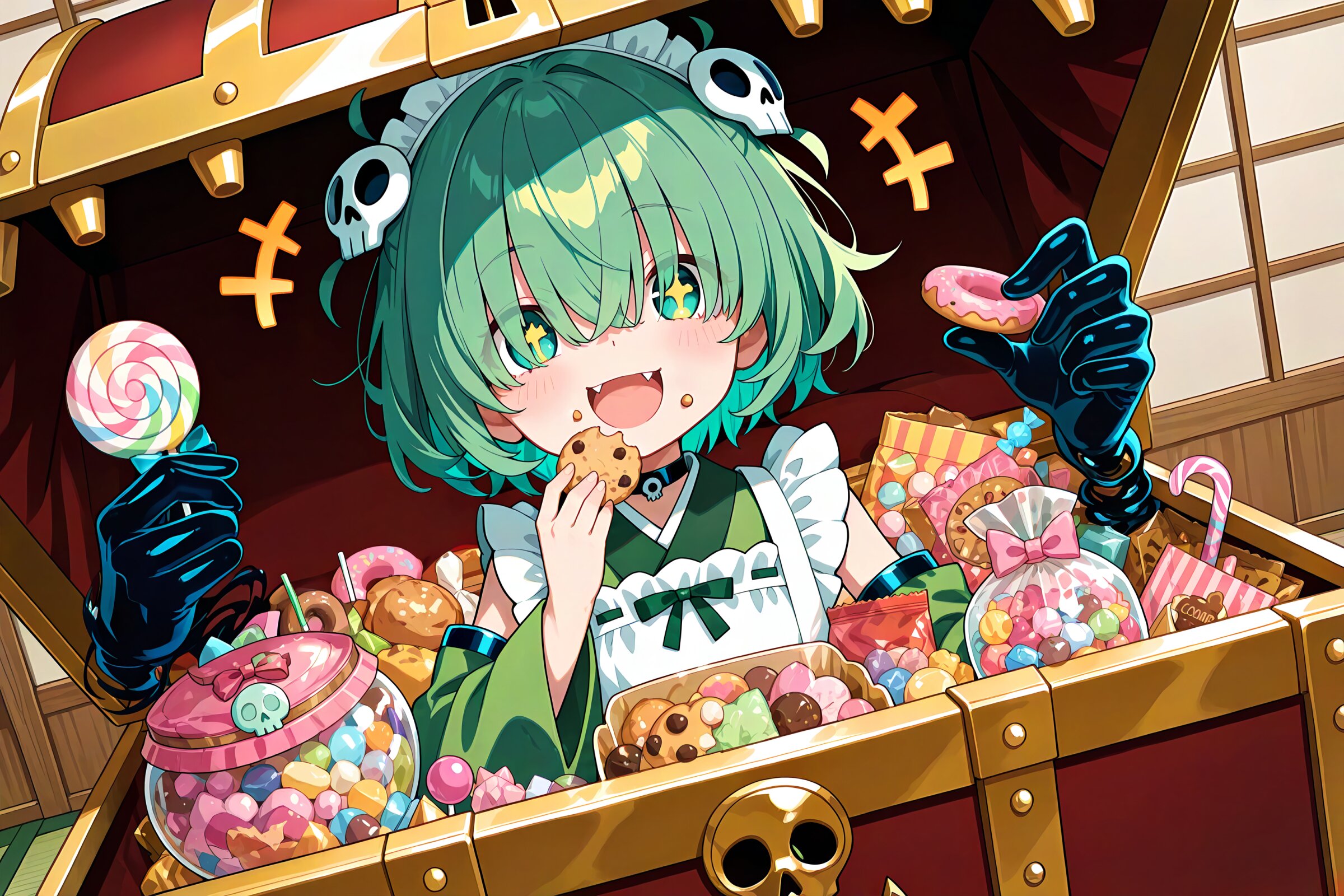 1 little girl, solo, diagonal angle, masterpiece, best quality, amazing quality, very aesthetic, cobalt green hair, short hair, messy hair, (hair over eyes:1.2), green eyes, demon fangs, +_+, closed mouth, smile, cheerful, +++, notice lines, choker, green wa maid outfit, (oversized sleeves:1.2), detached sleeves, (floating black ghosty hands:1.2), skull hair ornament, in mimic chest, holding lollipop, holding cookie, holding donut, too many candy, japanese room,