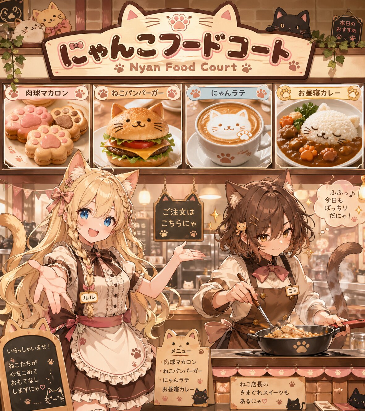 two girls, cat ears, natural cat tails, anime style, highly detailed, vibrant, soft lighting, warm color palette, food court atmosphere, cozy indoor, wooden counter, cafe setting, top area filled with menu photos, horizontal layout, food menu showcase, cute food photography style, glossy, delicious, steam, high detail food rendering, paw-shaped macarons, cat face burger, latte art with cat face, sleeping cat shaped curry rice, each food in separate frame, clean layout, menu board style, large signboard above, rounded cute font, cat themed logo, paw prints decoration, soft pastel colors, readable japanese style sign, "にゃんフードコート", playful typography, bottom area character scene, (left) blue eyes, long blonde hair, braid, hair between eyes, cat ears, natural cat tail, medium breasts, waitress outfit, apron, cheerful expression, welcoming pose, open arms, looking at viewer, slightly leaning forward, energetic, mascot girl vibe, (right) brown eyes, chestnut brown hair, wavy bob hair, loose inward curls, hair between eyes, cat ears, natural cat tail, medium breasts, :3, cook outfit, apron, focused expression, slightly smug face, cooking in frying pan, holding utensil, looking at food, dynamic motion, steam rising, confident chef vibe, only food depicted in menu photos and in cooking scene, no extra food scattered, clear composition, top menu section and bottom character section, clean separation, depth of field, soft glow, detailed textures, lively atmosphere