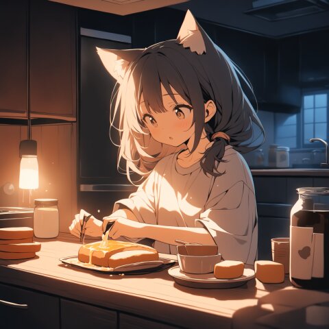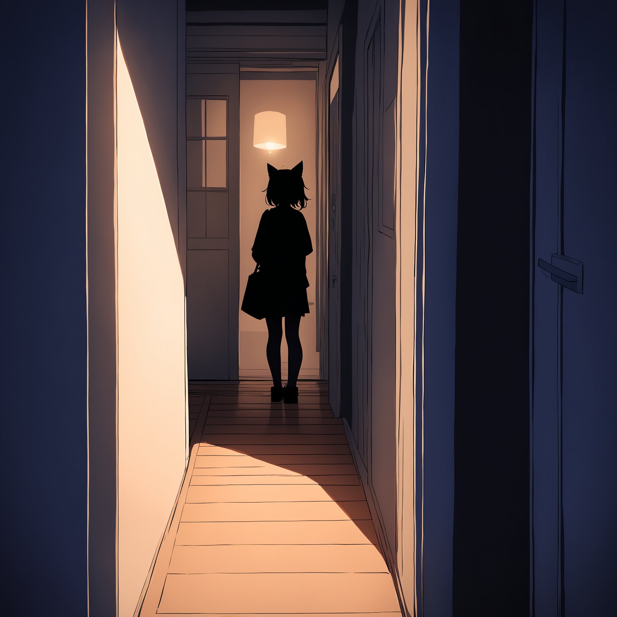 Masterpiece, lo-fi aesthetic, a cat-eared girl standing in a dimly lit entryway (genkan) at night. She is leaning against the wall, taking off her shoes after a long day. A warm light from the hallway illuminates her silhouette and school bag on the floor. Her cat ears are drooping slightly from fatigue, matching her relaxed and messy hair. A quiet, late-night domestic atmosphere, soft shadows on the wooden floor, cinematic lighting, intricate details of shadows and clothing folds, 8k.