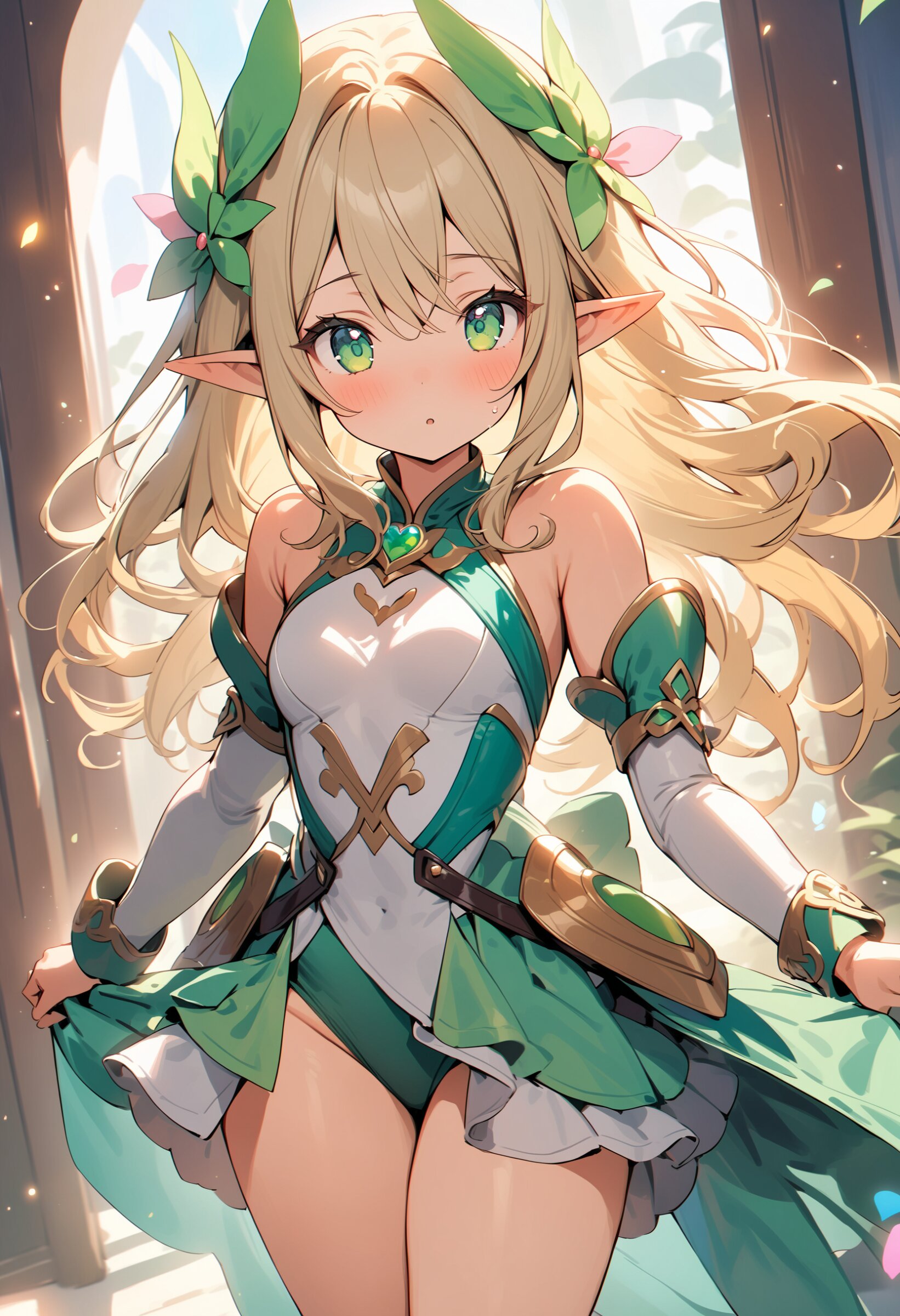 ((masterpiece)), ((best quality)), ((kawaii)), cute, (lovely), ((extremely detailed)), (beautiful), dynamic angle, a cute girl, 1girl, solo, ((elf)),beautiful blond hair, beautiful green eyes, ((beautiful eyes)), long hair, fantasy clothes,