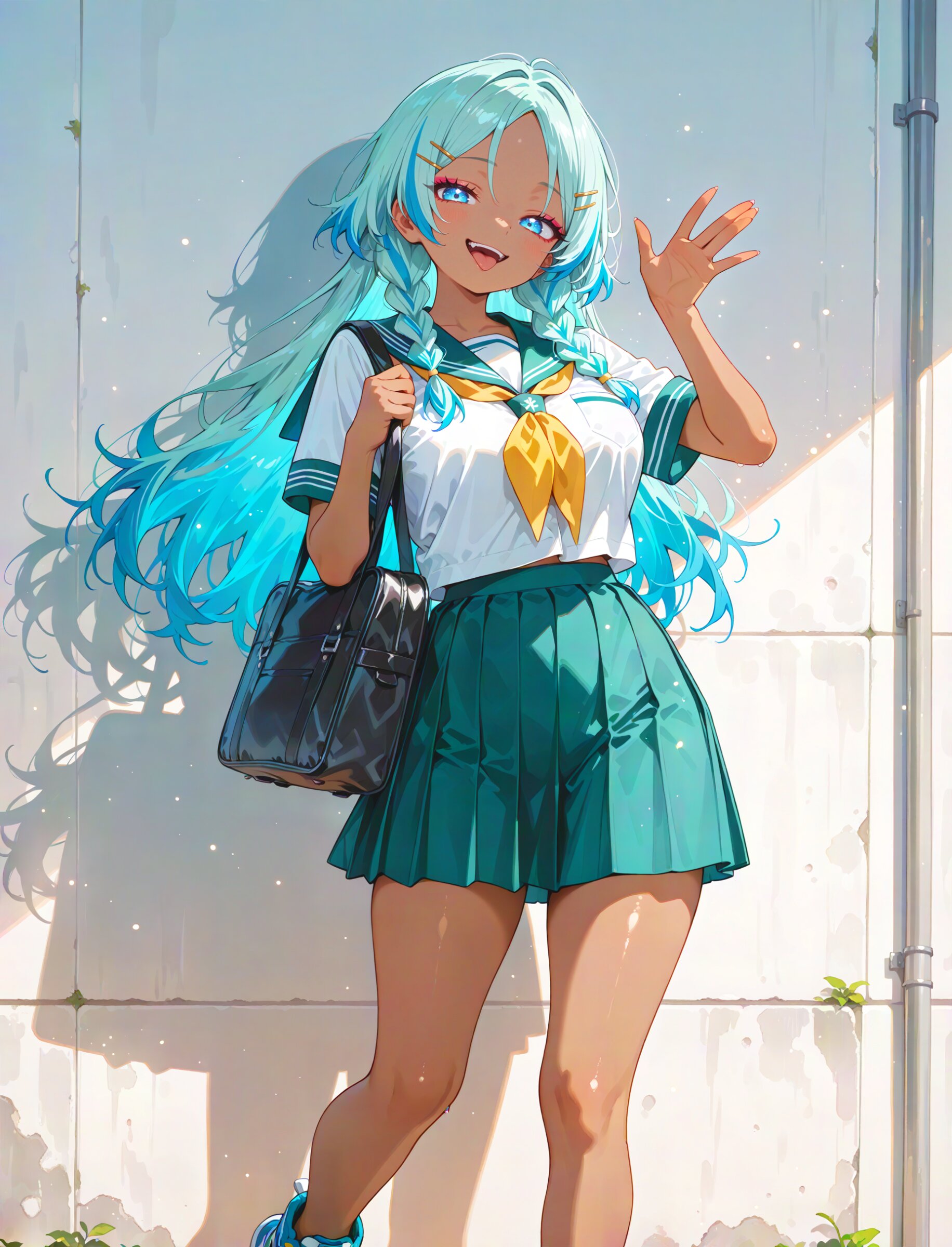 Over the Shoulder Shot, looking back (character focus:1.2), feet out of frame from below, looking down looking at viewer, Line art is drawn in a warm brown tone instead of black. The outlines have a soft, earthy feel, adding a gentle and nostalgic atmosphere to the illustration. 1gyaru, beautiful detailed eyes, cute face, cool, light skin, skindentation, beautiful aquamarine eyes, , , cerulean blue hair, bisque streaked hair, highlights hair cute, long hair, side braids parted bangs hairclip , dyed bangs, first-rate female body perfect body beautiful large breasts, smart hips, makeup, , warm comfy :p and naughty face and (laughing:1.5), seductive smile green serafuku, short sleeves, neckerchief , long plated skirt, , sneakers , a school bag (crazy smile:1.0), (simple watercolor background:1.0), drop shadow, transparent background waving, standing, contrapposto masterpiece, best quality, amazing quality, very aesthetic, absurdres, newest, you can add scenery, (volumetric lighting), To make the background more distinctive. professional art lots of details, , overexposure, shiny-glistening, (watercolor style:1.0), (pastel color style:1.0) 4ur4_illu,shiny, glowing, glowing particles, glowing light particles, light particles, flame green, <lora:noline (1):-0.5> <lora:sdxl2-flat2-512b:0.2> <lora:facelightup_xl_v10:0.5> <lora:V2_yakumo_alchemy:0.5> <lora:Aura_illu:0.1>