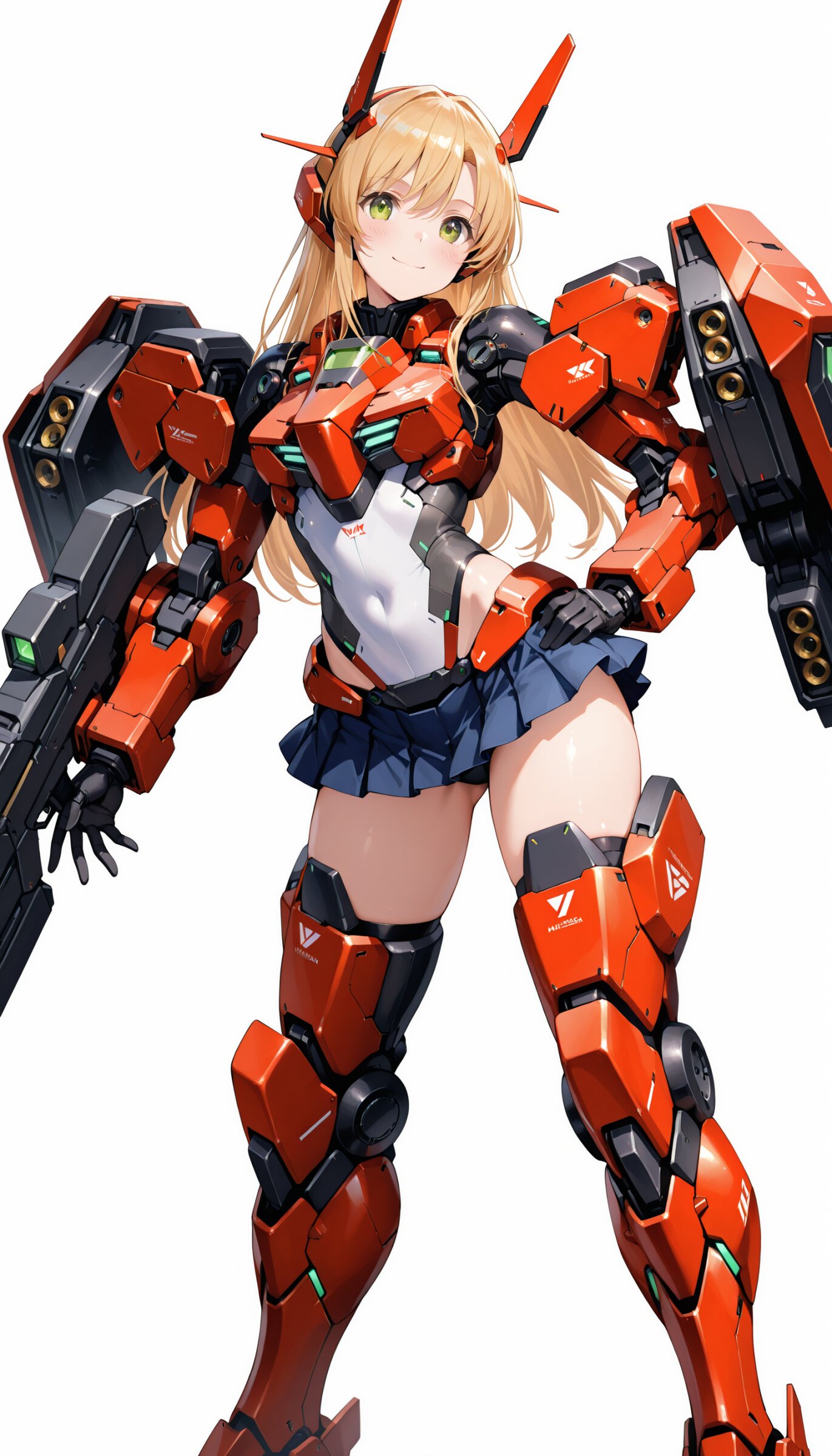1girl, ((white background)), ultra detailed 8k cg render, masterpiece, high resolution, extremely detailed, mecha musume,mecha shoulder, mech leg, headgear, mecha armor, ((mini skirt)),long blonde hair, dropping green eyes, smile, dynamic posing,