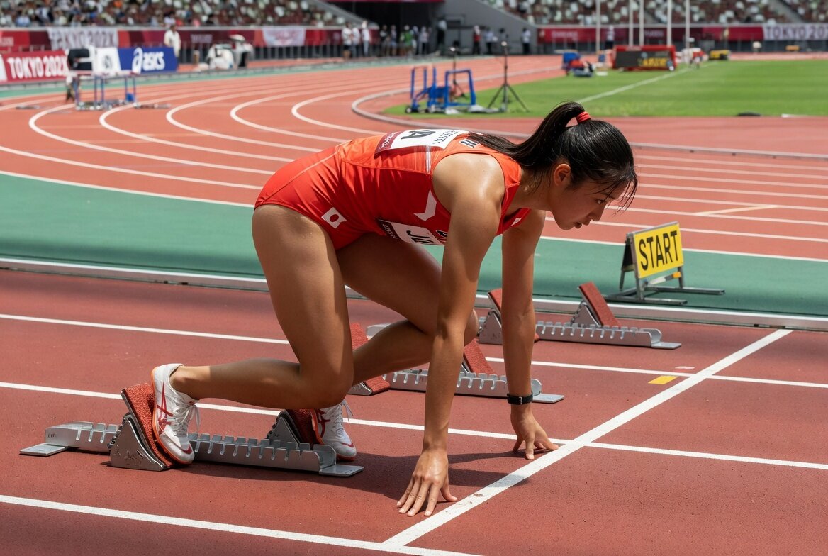 日本の女性20歳のリアルなフォト。プロのカメラマンによる撮影のような仕上がり。エンジ色のジャージとドルフィンショーツ。短距離走のクラウチングスタートで、腰を高くしてスタート直前。側面の構図。背景は陸上競技場のトラック。