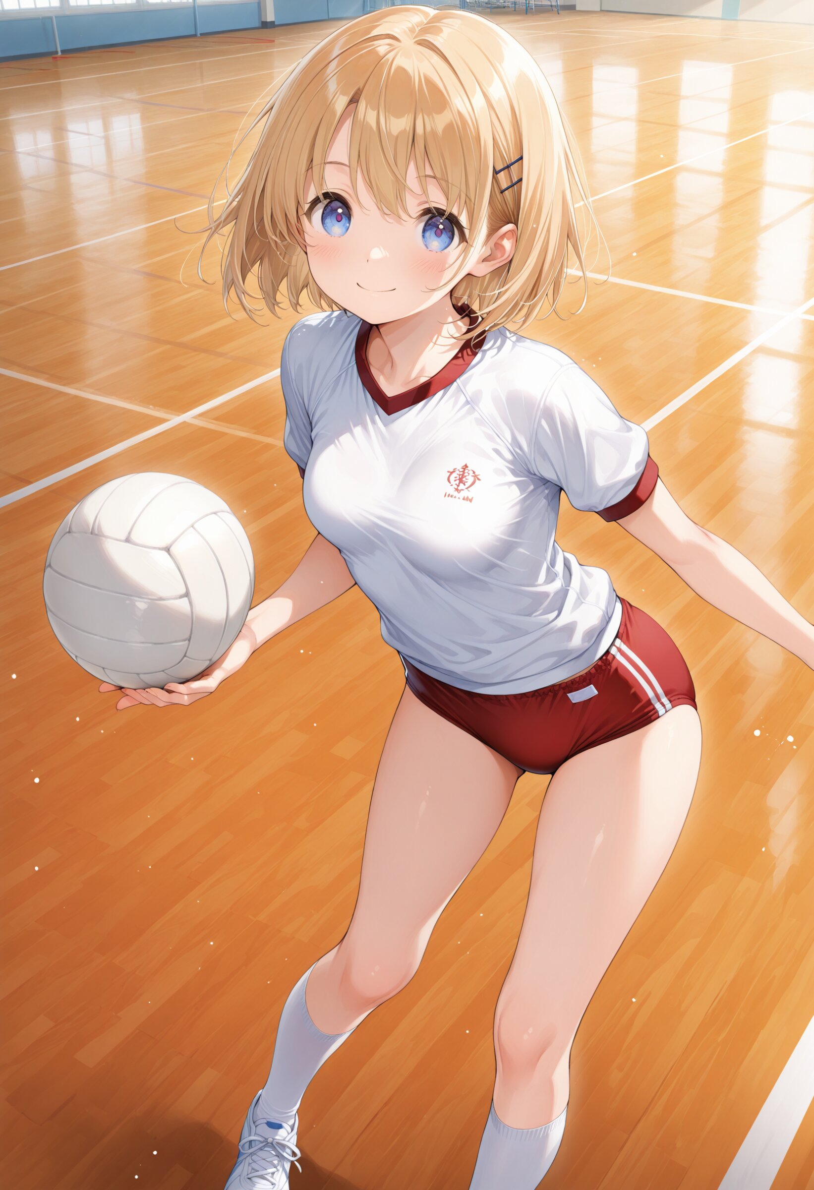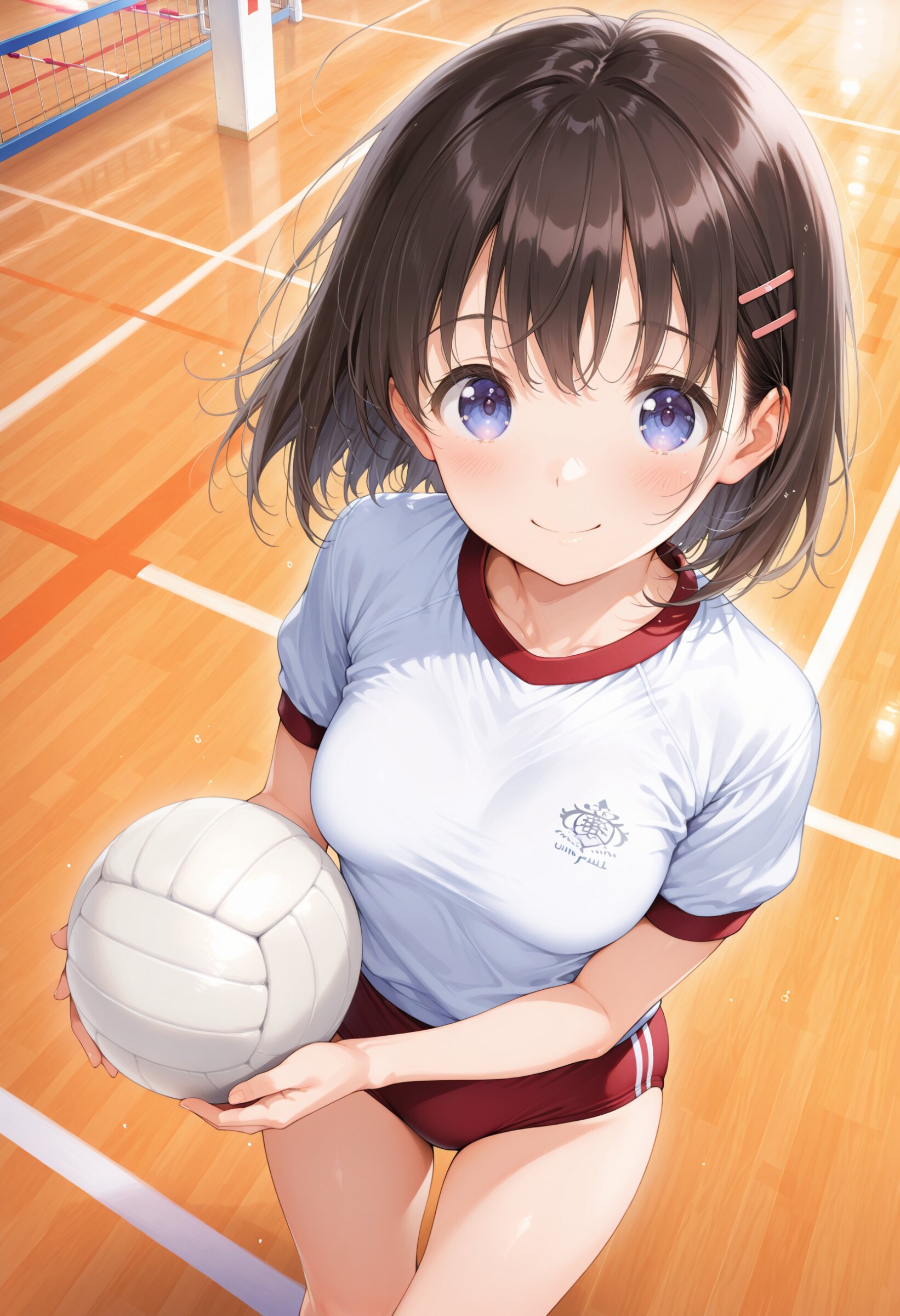 masterpiece, best quality, amazing quality, general, fine detail, official art, 1girl, loli, petite, beautiful hair, beautiful eyes, school gym uniform, high-cut buruma, beautiful legs, medium breasts, school gym, innocent expression, smile, playing volleyball, dynamic action, from above, happy,
