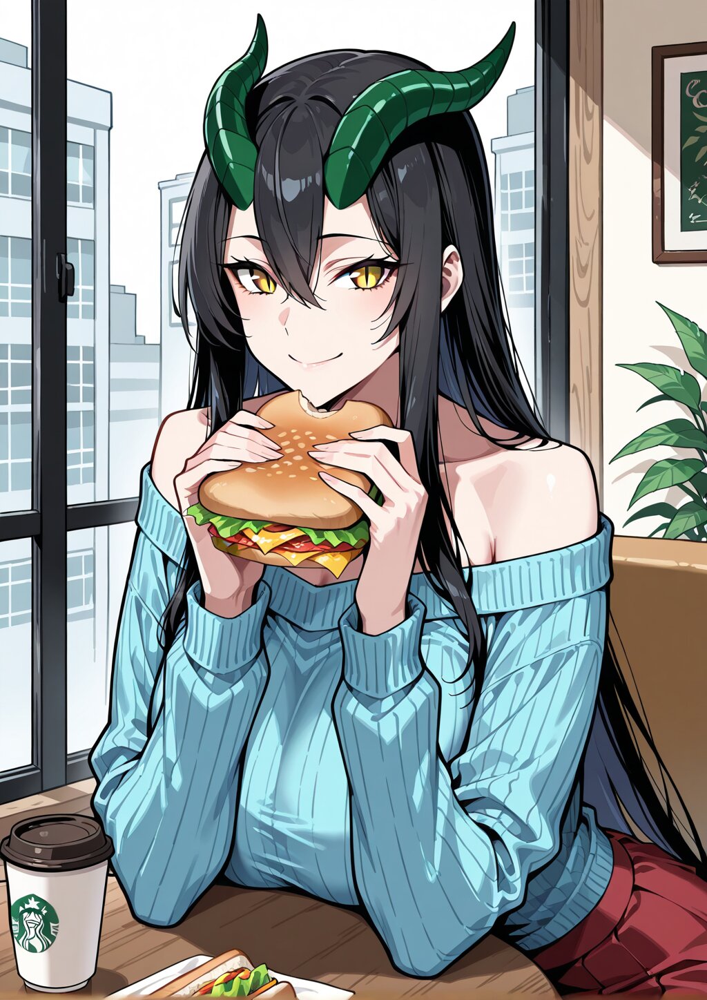 <lora:tsutsuji:1>, Tsutsuji_OC, black hair, long hair, straight hair, hair between eyes, sidelocks, green dragon horns, horns facing backward, horns on forehead, yellow eyes, slit pupils, neon blue sweater, off shoulder, red long skirt, solo, looking at viewer, upper body, standing, smile, cafe, window side, sitting, table, one disposable coffee cup on table, holding sandwich