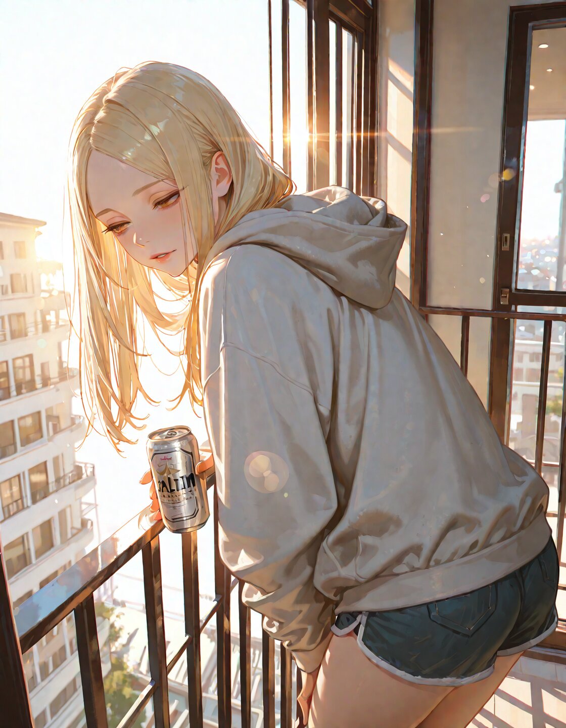 solo,1Girl,long hair,straight hair,blonde hair,forehead,center parted bangs,dark amber eyes,slant eyes,silky hair,delicate face,delicate hair,beautifully detailed hair,defined detailed face,delicate facial features,beautiful detailed eyes,catchlight in eyes,detailed clothes,delicate fablic,subsurface scattering, soft light diffusion, cute face,looking forward,half open eyes,parted lips,Leaning forward the balcony railing,holding a beer can, Grey hoodie,shorts, masterpiece,best quality,insanely detailed,beautiful,16k,photorealistic, at the balcony,in the afternoon,spring day,calm atmosphere,sunlight,lens flare, warm lighting, in focus with blurred backgroundsoft lighting,bloom,(from behind:1.4),from above
