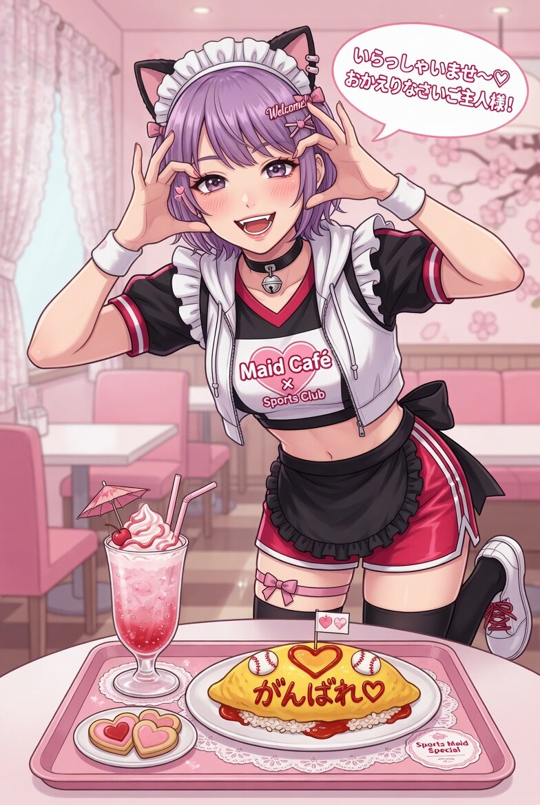 メイド喫茶のメイドである女性のデジタルイラスト。スポーツウェア風ファッション。オムライスと、桜色のドリンクを前に、ハートハンドのポーズ。歓迎の笑顔。