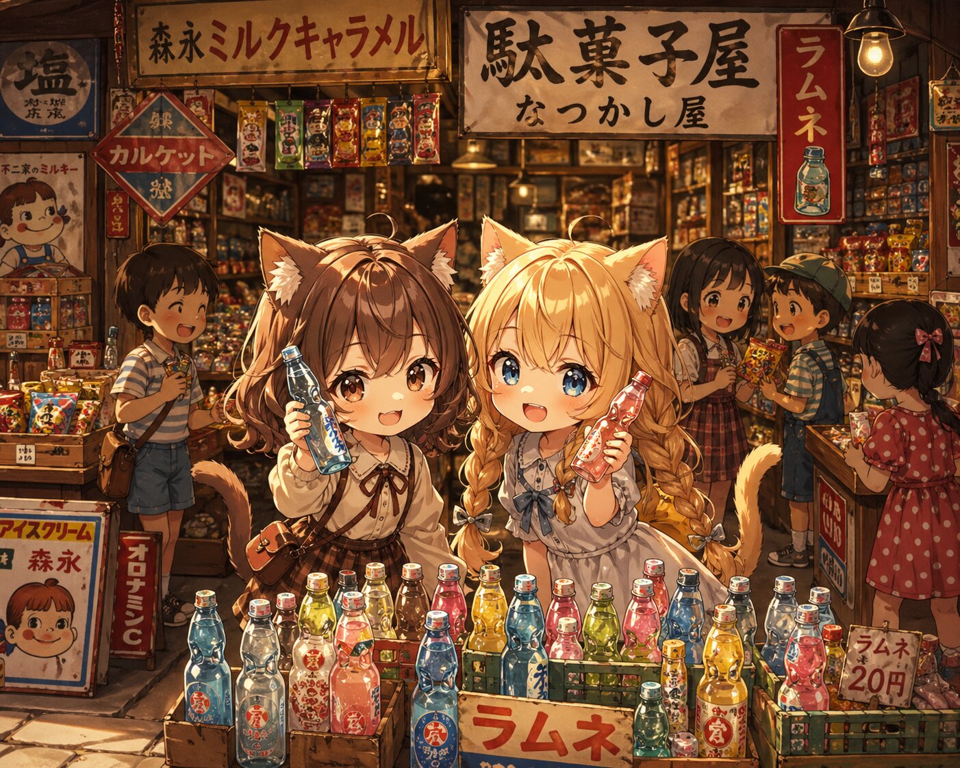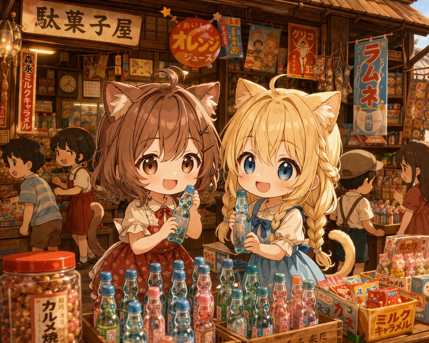 2girls, chibi style, super deformed, highly detailed, warm nostalgic atmosphere, showa retro japanese dagashi shop, brown eyes, chestnut brown hair, wavy bob hair, loose inward curls, hair between eyes, cat ears, natural cat tail, medium breasts, :3, blue eyes, long blonde hair, braid, hair between eyes, cat ears, natural cat tail, medium breasts, :3, both girls smiling happily, joyful expression, holding ramune bottles, playful interaction, looking at viewer, surrounded by many colorful ramune bottles in wooden crates, glass bottles with marble tops, dagashi (japanese candy) everywhere, retro candy packages, hanging snacks, small toys, children in background enjoying shopping, lively atmosphere, busy candy shop, wooden interior, old japanese signs, handwritten price tags, vintage posters, paper decorations, warm sunset lighting, soft golden glow, slight film grain, nostalgic color grading, depth of field, rich details, cluttered composition, cozy feeling, anime style, high quality