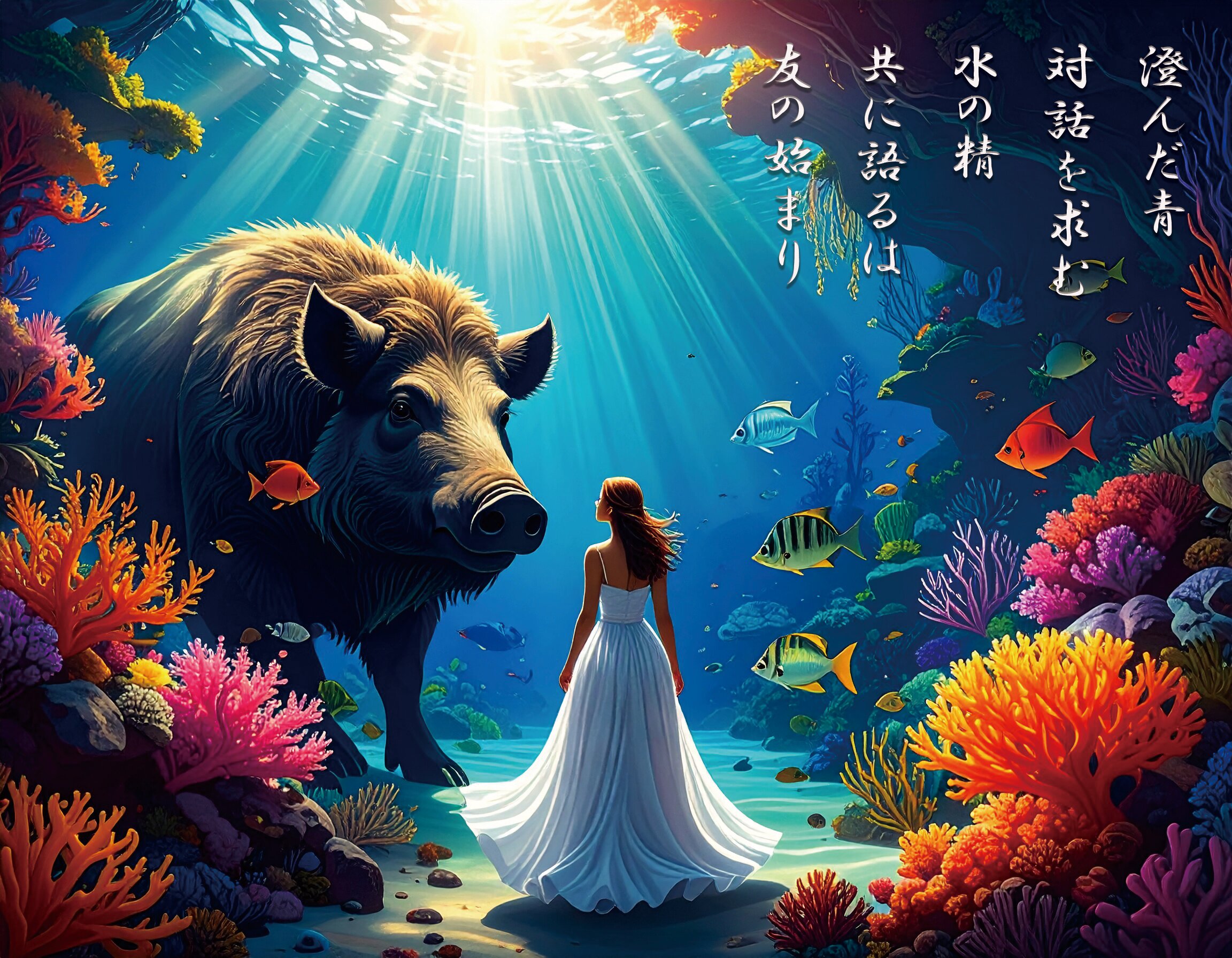 海イノシシと水の精霊 石上夢悟朗 2026/4/28使用したAI その他 年齢制限 全年齢 いいね0 シェア #短歌 #動物 澄んだ青対話を求む水の精共に語るは友の始まり海の中に住む猪。周りから怖がられるものの、実は気のいい奴です。思い切って話し掛けたら、きっと仲良くなれるでしょう。※このイラストは『Adobe Firefly 公式モデル』を使用して生成しました。 プロンプト なし コメント 送信 石上夢悟朗 2026年3月より活動開始 5投稿2フォロー2フォロワー 幻想と生物をテーマにイラストを投稿していきます。 自作小説に登場するキャラクターや風景を作りたいと思ったことが、AI画像生成を始めたきっかけ。 投稿作品は『現代版七つの大罪ファンタジー』シリーズです。 また、ネットショップ 『幻象店~AI画像グッズ販売所』の運営も行っております。 https://gennshouten.theshop.jp フォローする 他の作品 全てを見る 駆ける馬 雲の上で食べる綿飴 蒼穹列車が見た天使 魔法学園の放課後