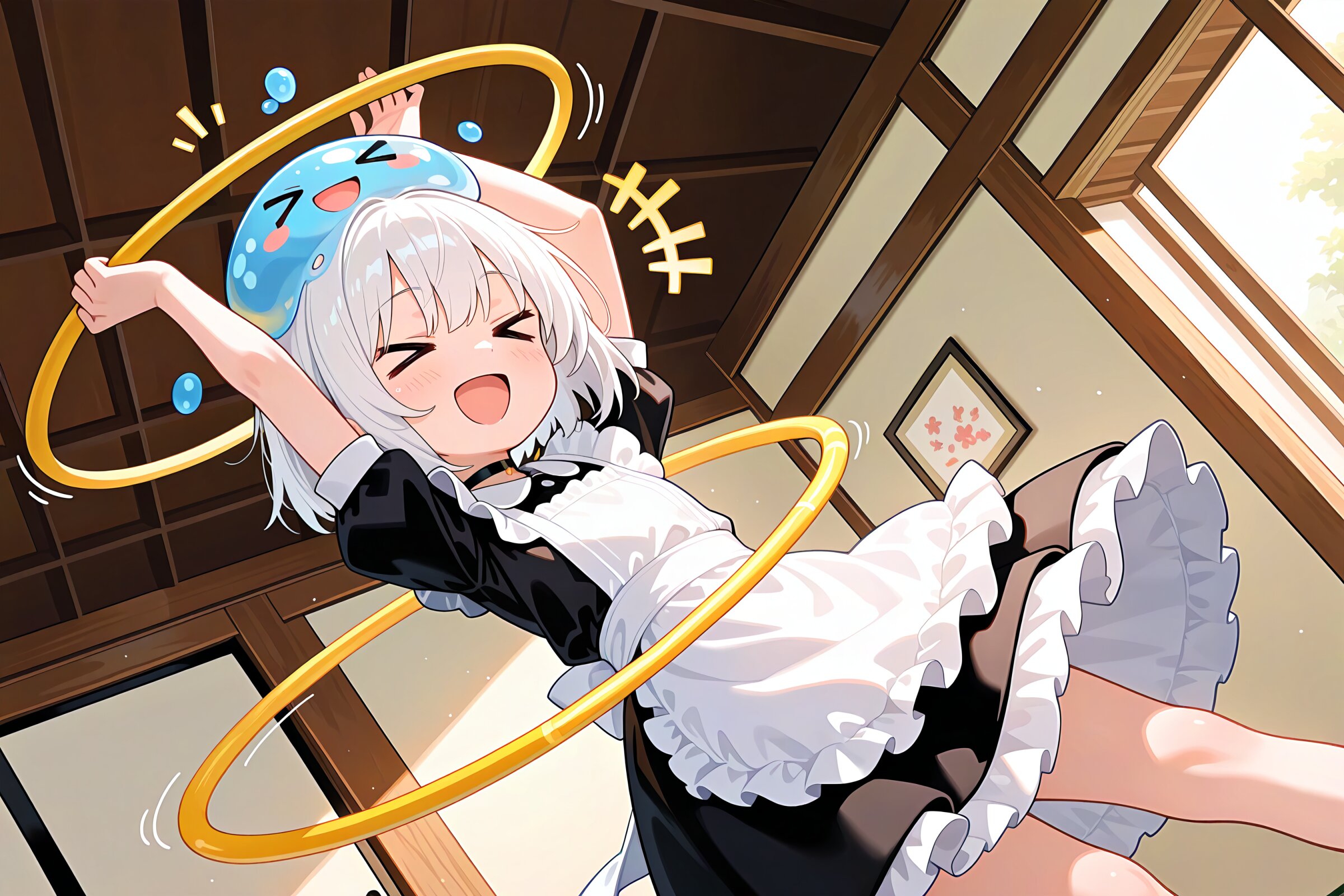 1 little girl, solo, diagonal angle, masterpiece, best quality, amazing quality, very aesthetic, white hair, short hair, > <, open mouth, smile, cheerful, +++, notice lines, choker, maid outfit, hula hoop, motion blur, afterimage, motion lines, motion lines, attack trail, arms up straight, banzai, slime on her head, > <, in japanese room,