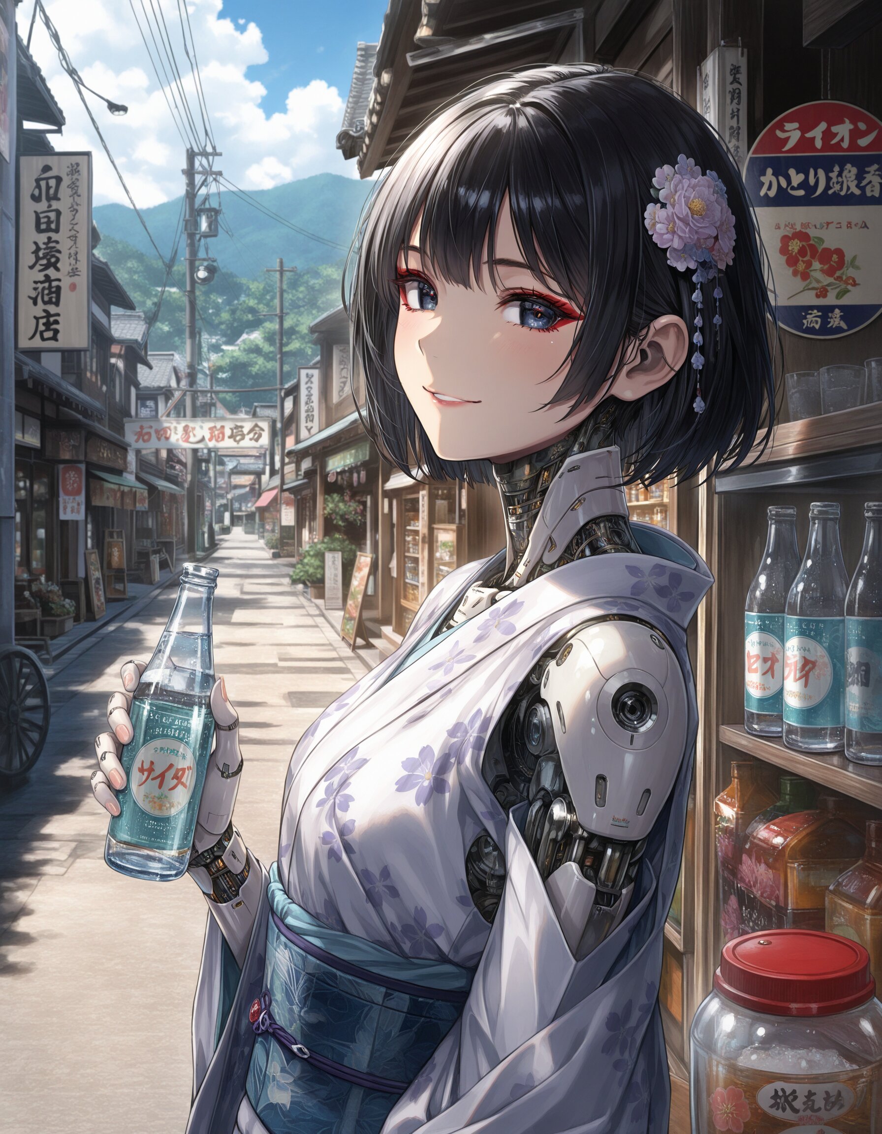 (ultra-detailed painting),showa era,daytime,japanese retro country town,street,drink store,daytime,1girl,solo,(android lady),black hair,straight hair,floral hair ornament,gentle smile,makeup,kimono style cloth,holding a cider with glass bottle,((masterpiece, best quality, extremely detailed, absurdres)),