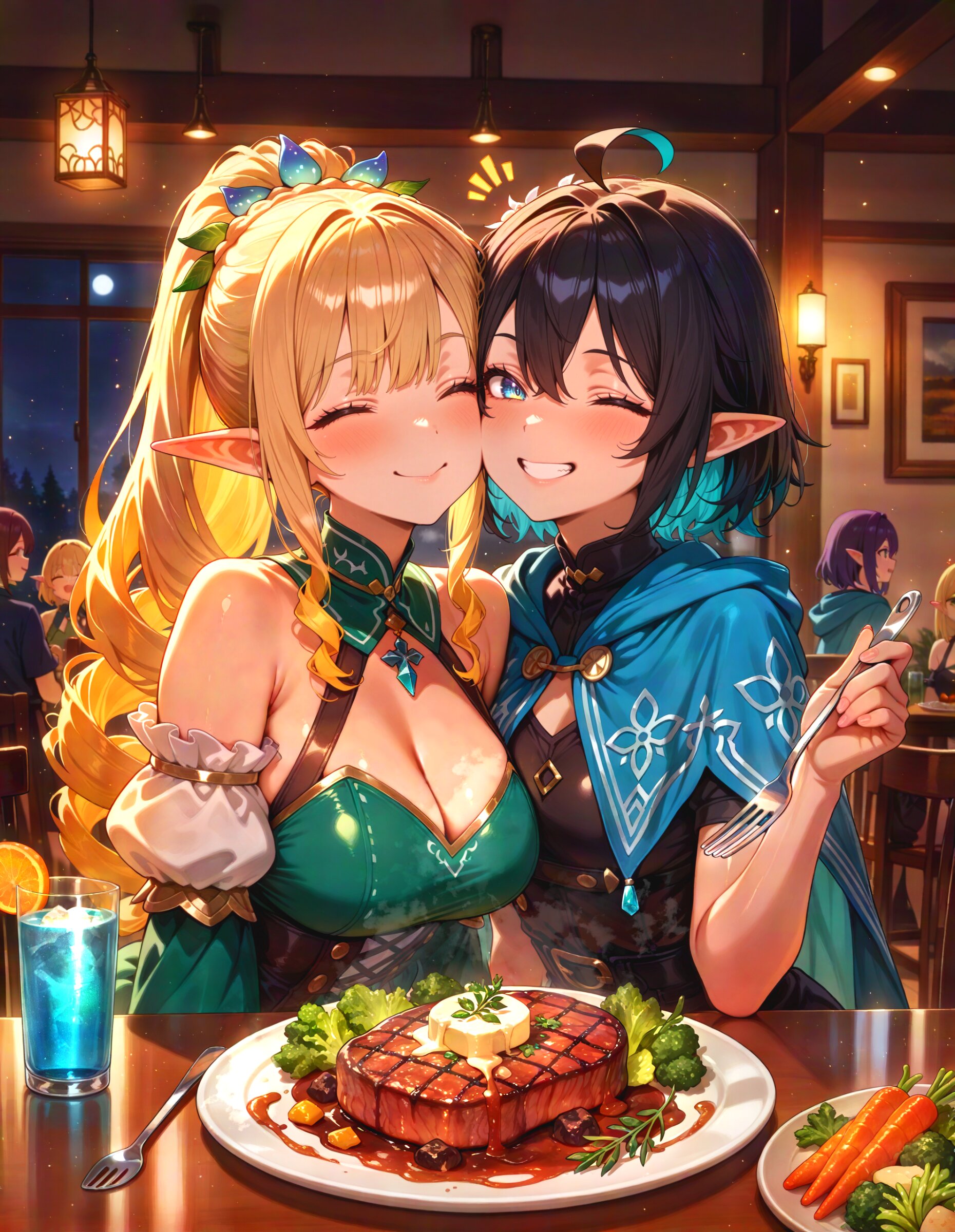 masterpiece, best quality, ultra-detailed, anime style, digital illustration, two girls, two elf girls, intimate pose, holding each other, cheek-to-cheek, smiling, happy, cozy atmosphere A large, thick-cut, perfectly Dry-Aged Ribeye steak is presented on the white plate. The steak possesses a deeply rich, caramelized, Maillard-reacted crust, indicating perfect high-heat cooking. A generous pat of homemade truffle-herb compound butter is visibly and slowly melting atop the steak crust, creating a glistening, flavorful sheen. Sprigs of fresh, coarse rosemary and thyme are embedded in the melting butter. Small flecks of black truffle are visible. A close-up view reveals a small, perfectly medium-rare cross-section suggesting tenderness (if possible to show or suggest without cutting). professional art lots of details, , overexposure, shiny-glistening, (watercolor style:0.0), (pastel color style:1.0) 4ur4_illu,shiny, glowing, glowing particles, glowing light particles, light particles, <lora:noline (1):1.0> <lora:sdxl2-flat2-512b:0.2> <lora:facelightup_xl_v10:0.5> <lora:V2_yakumo_alchemy:0.5> <lora:Aura_illu:0.1>