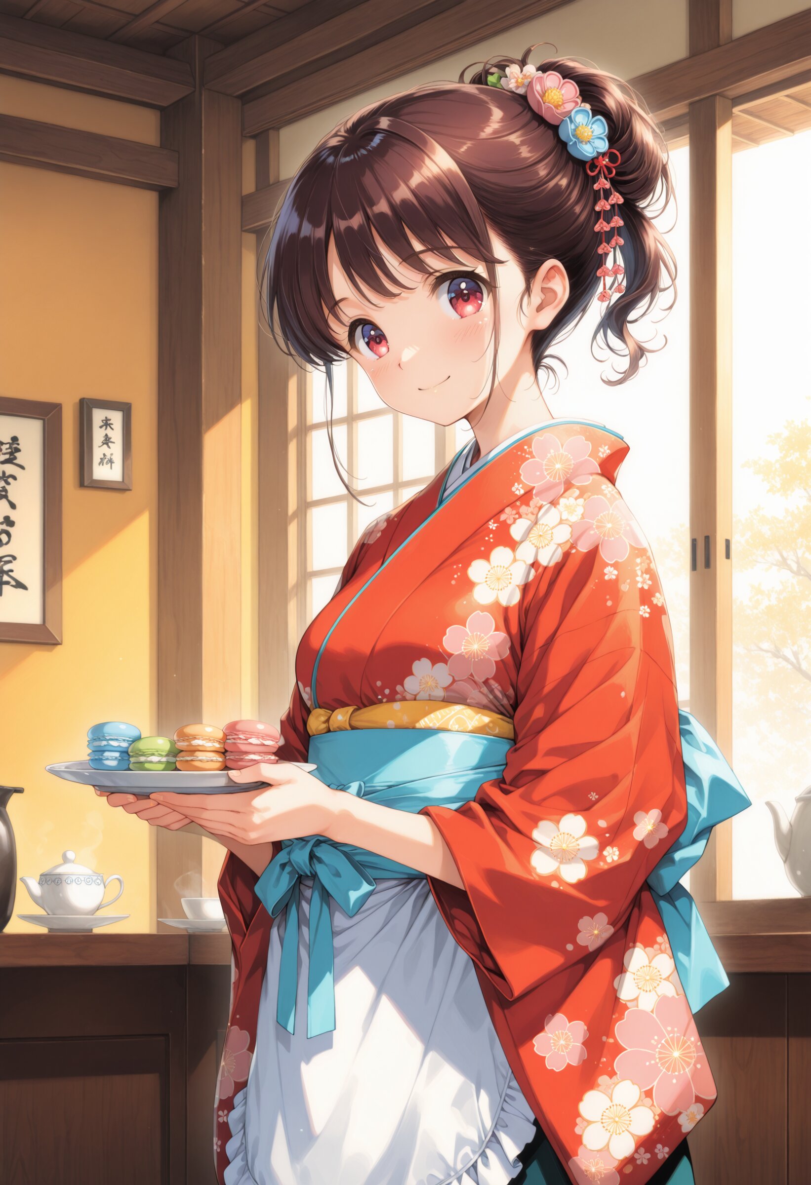masterpiece, best quality, highres, ultra-detailed, extremely detailed, 1girl, loli, petite, youthful appearance, beautiful hair, beautiful eyes, japanese waitress, retro cafe waitress, showa era style, wearing traditional kimono, retro kimono, patterned kimono, apron over kimono, waist apron, traditional waitress style, hair neatly tied, classic hairstyle, retro hair accessories, Japanese retro cafe, showa era cafe, nostalgic atmosphere, wooden interior, warm lighting, vintage decor, carrying a plate of macarons, serving pose, gentle smile, innocent expression, slightly cheerful, dynamic pose, cowboy shot, soft lighting, warm tones, nostalgic, cozy atmosphere, medium breasts, from side,