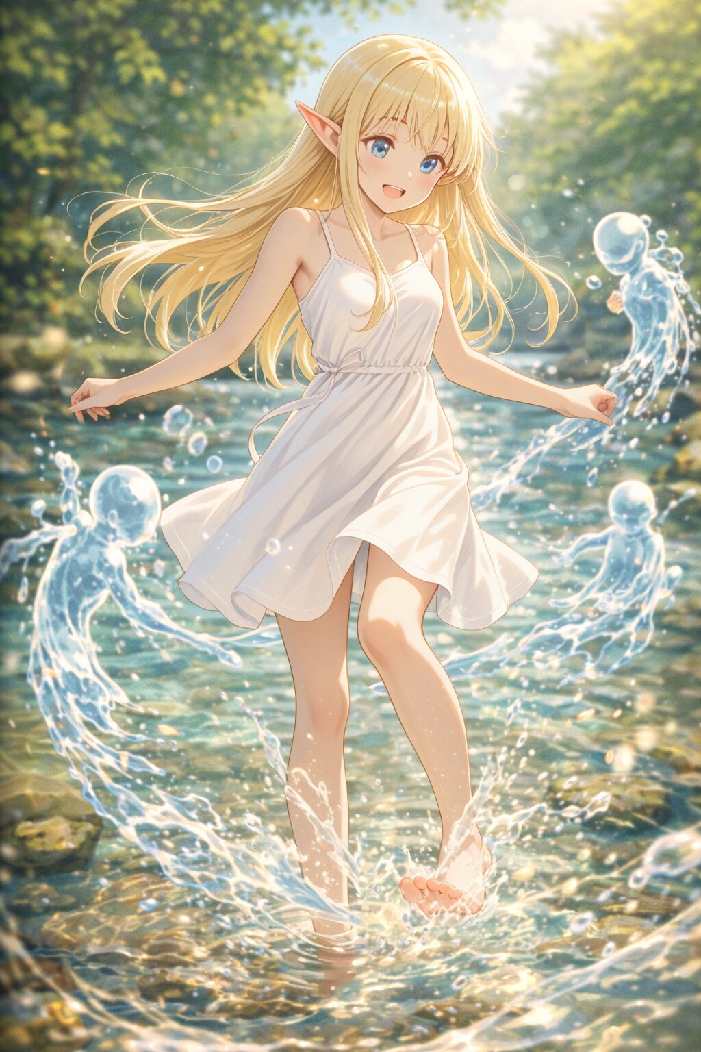 Japanese anime illustration, vertical composition, 9:16 aspect ratio, high detail, clean line art, soft cel shading, vibrant anime colors. A blonde elf girl with long straight hair and blue eyes, wearing a soft, light, thin dress in white or pale pastel colors. Scene: She is standing in a shallow, clear stream, playfully splashing water with her feet as if dancing. Her movement is light and joyful, creating small splashes around her. Clothing: Her dress is made of light, soft fabric that moves gently with her motion, suitable for being near water without feeling out of place. Water and spirits: Around her, the flowing water subtly forms spirit-like shapes, as if small water elementals are moving with her. They do not cling to her body, but instead flow and swirl nearby, following her rhythm, almost like they are dancing together with her. Lighting: Bright daylight reflecting on the water surface, creating sparkling highlights. Atmosphere: Fresh, lively, and slightly magical, blending a natural outdoor setting with a gentle fantasy presence. No text, no logo, no watermark. openmouth big smile, anime style, anime color,, masterpiece, amazing quality, very aesthetic, high resolution, ultra-detailed, absolute, newest, 2d, semi-realistic, moe heroine, sharp focus,, soft lighting, rim lighting, volumetric light, lens flare, bokeh, ((Countless light particles floating around)), nice hand, perfect hand, perfect anatomy, five-finger,, beautiful eyes, ultra detailed lips, ultra detailed face and hair, kawaii, adorable, cute, medium breast, slim waist, wide hip,