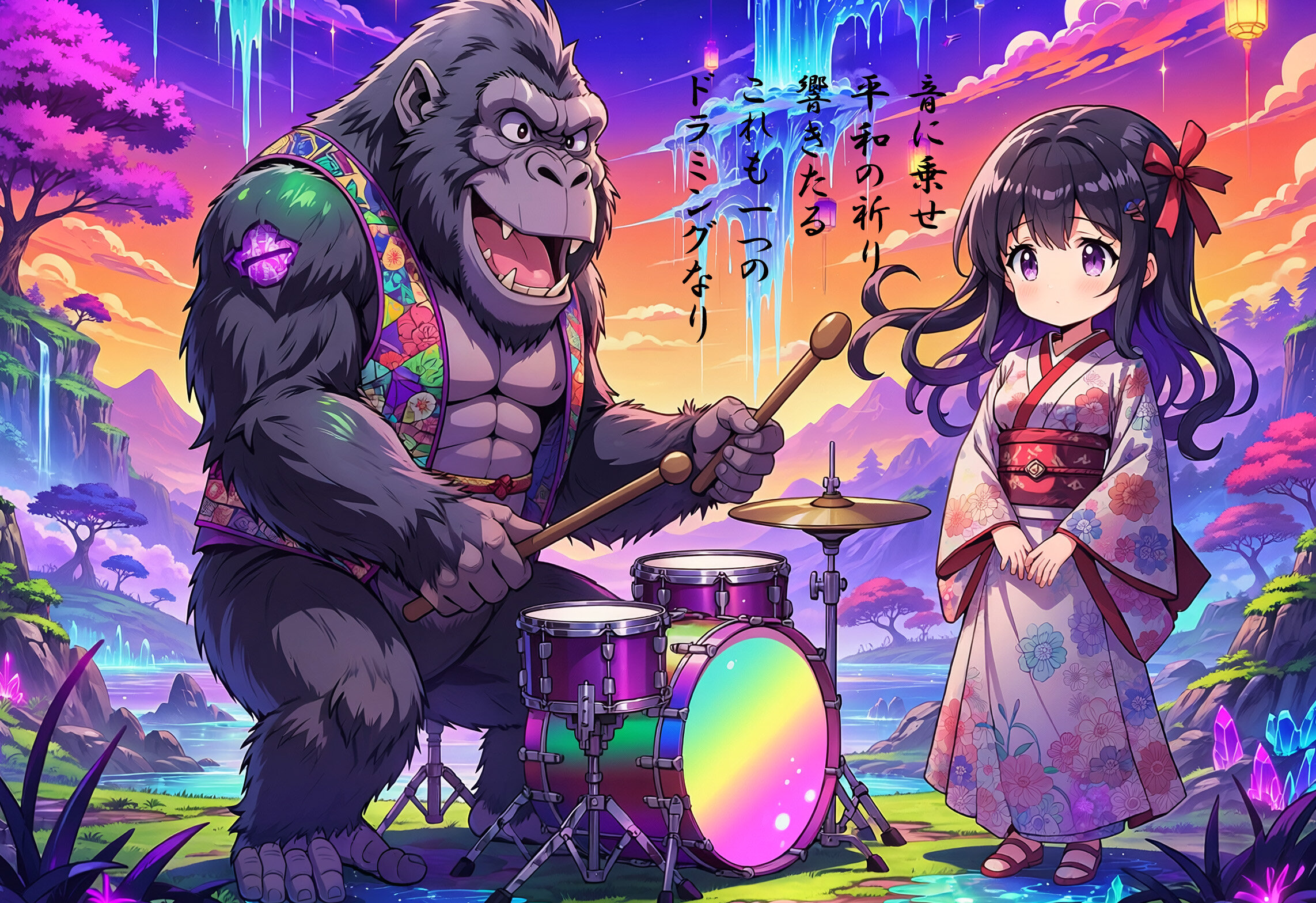 平和を祈る演奏 石上夢悟朗 2026/4/29使用したAI その他 年齢制限 全年齢 いいね3 シェア #短歌 #動物 #美少女 音に乗せ平和の祈り響きたるこれも一つのドラミングなり手の平で胸を叩いて音を鳴らすコミュニケーション。きっと進化したゴリラは、ドラムの演奏で平和を祈るでしょう。※このイラストは『Adobe Firefly 公式モデル』を使用して生成しました。 プロンプト なし コメント 送信 石上夢悟朗 2026年3月より活動開始 11投稿2フォロー3フォロワー 短歌+AIイラストが好きです。作品をファミマプリントクリエイターズで販売中。 https://creators-fp.family.co.jp/1U9G また、ネットショップ『幻象店~AI画像グッズ販売所』も運営しています。 自作小説『現代版七つの大罪ファンタジー』や幻想と生物をテーマにした制作物です。 よければxのプロフィールリンクから遊びに来てください。 フォローする 他の作品 全てを見る キツネとサカナの輪舞 お座りオオカミ カルガモとの語らい 空飛ぶゾウと少女の願い 鹿と心 海イノシシと水の精霊 駆ける馬 雲の上で食べる綿飴 蒼穹列車が見た天使 魔法学園の放課後