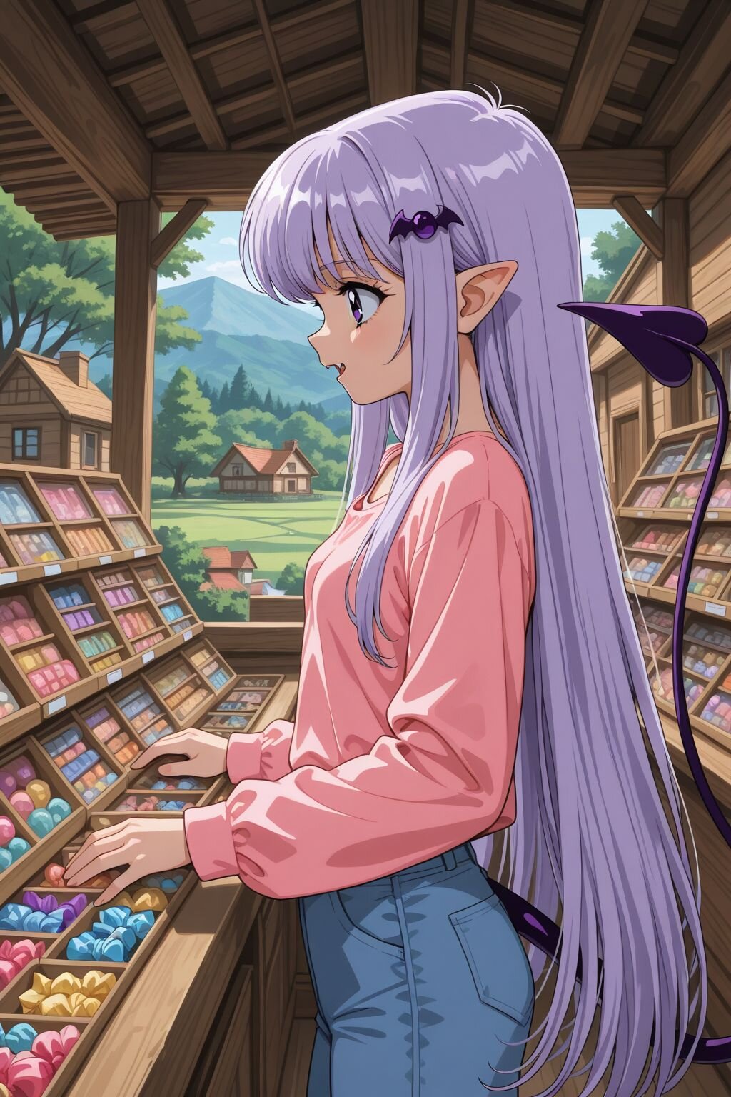 1girl, solo, straight hair, medium bangs, naturally flowing hair, left hair ornament, Light purple hair, very long hair, purple eyes, pointy ears, fangs, mini breasts, purple devil's tail, spring clothes, long sleeves, retro, tree house, Landscape, buildings, Candy store, indoors, spring date outfits, pants, from side,