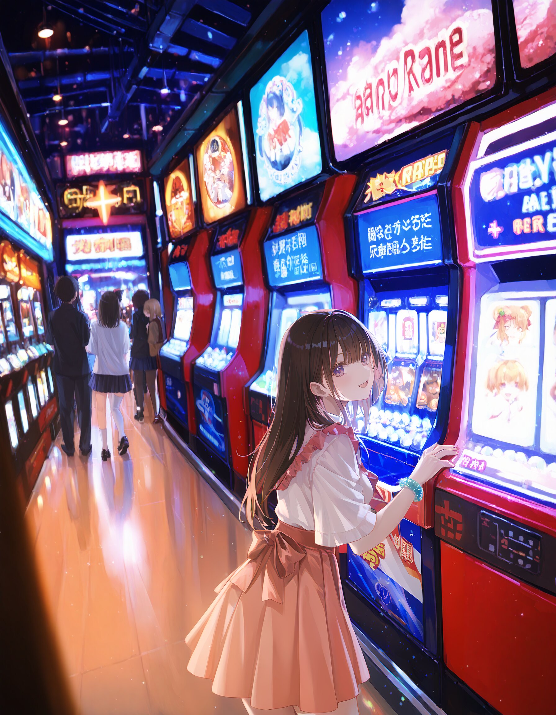 masterpiece, best quality, amazing quality, very aesthetic, high resolution, ultra-detailed, absurdres, newest, scenery BREAK 1girl, solo BREAK day, indoor, (japanese arcade:1.4), (posters:1.2), crowded, depth of field, volumetric lighting