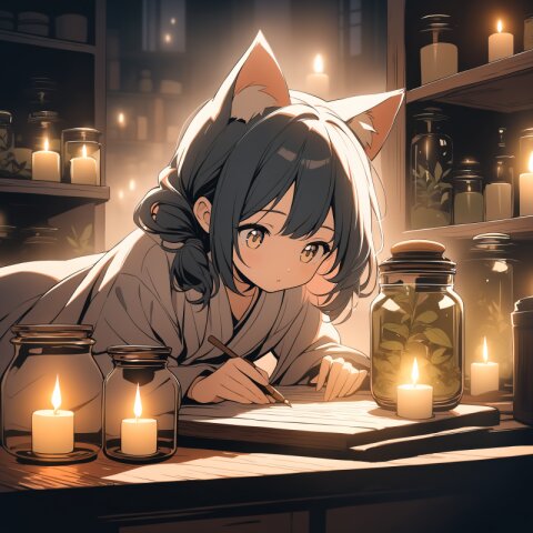 Masterpiece, lo-fi aesthetic, a cat-eared girl sitting on a soft rug, carefully polishing a small glowing star with a silk cloth. The glowing star itself provides the main warm light, casting a celestial radiance on her face and the astronomical charts spread across the floor. A vintage brass telescope and celestial orbs are in the corner of the room. Her cat ears are perked up toward the starlight, matching her messy but cute hair. Intimate and dreamlike atmosphere, dimly lit workshop background, cinematic lighting, intricate details of light reflections and celestial maps, 8k.